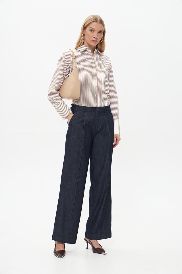 Классический крой рубашечного типа с длинными рукавами и воротником делает блузку универсальной. Вертикальная полоска визуально вытягивает силуэт и добавляет образу динамики.