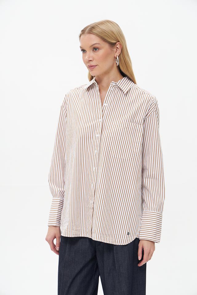 Бежевая блузка Bugatti с вертикальной полоской из 100% хлопка. Классический крой, длинные рукава и воротник рубашечного типа делают эту модель универсальной основой для создания стильных образов. Состав: хлопок 100%