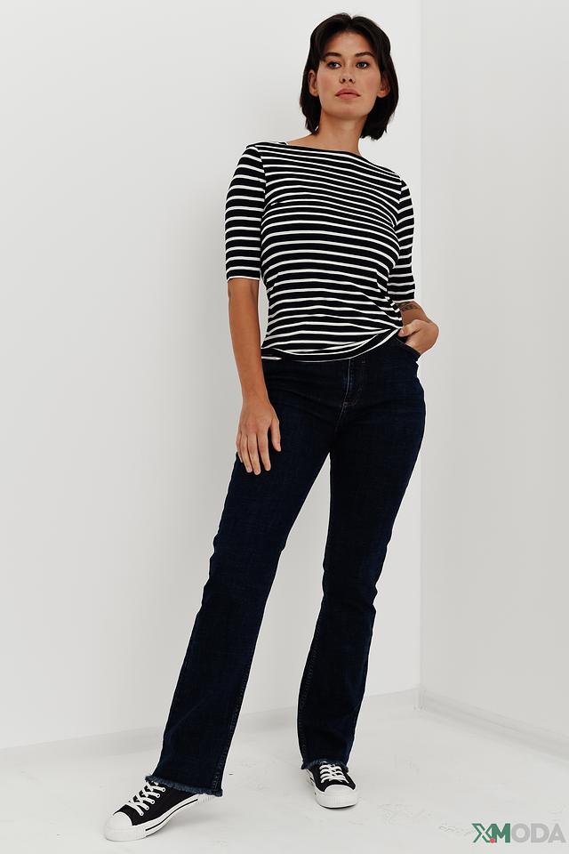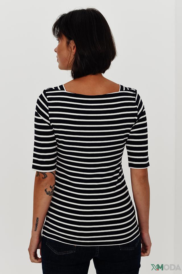 Блуза Comma чёрно-белого цвета с коротким рукавом и округлым вырезом. Модель выполнена в классическую полоску, что делает её универсальным элементом гардероба. Изготовлена из мягкой вискозы с добавлением эластана. Состав: вискоза 92%, эластан 8%