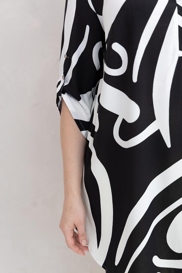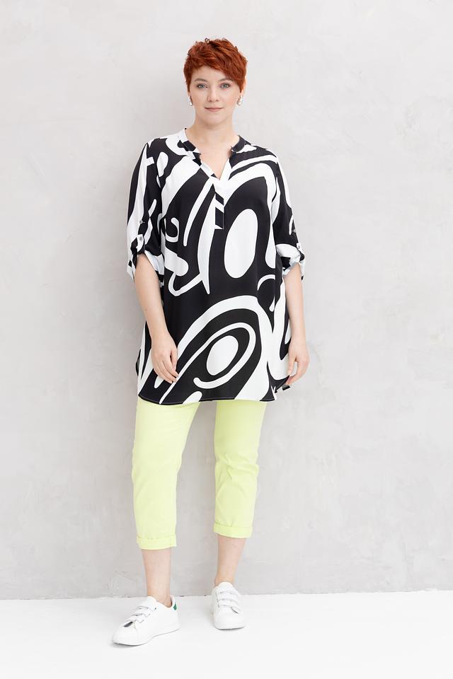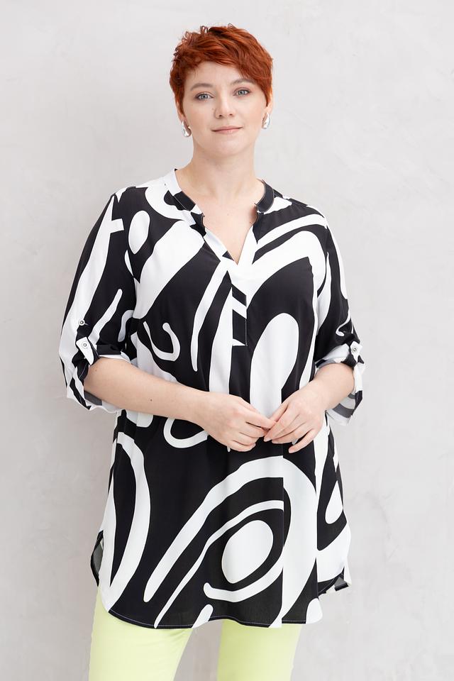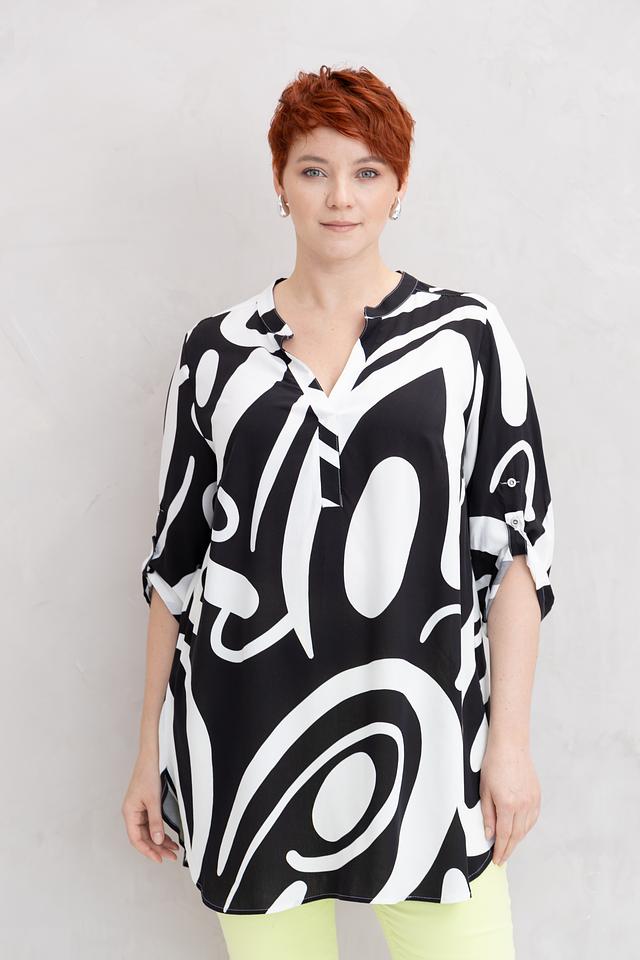 Эта стильная блуза от бренда Doris Streich станет отличным дополнением к вашему гардеробу. Блуза выполнена в классической чёрно-белой гамме и украшена эффектным абстрактным принтом, который придаёт ей современный и динамичный вид.