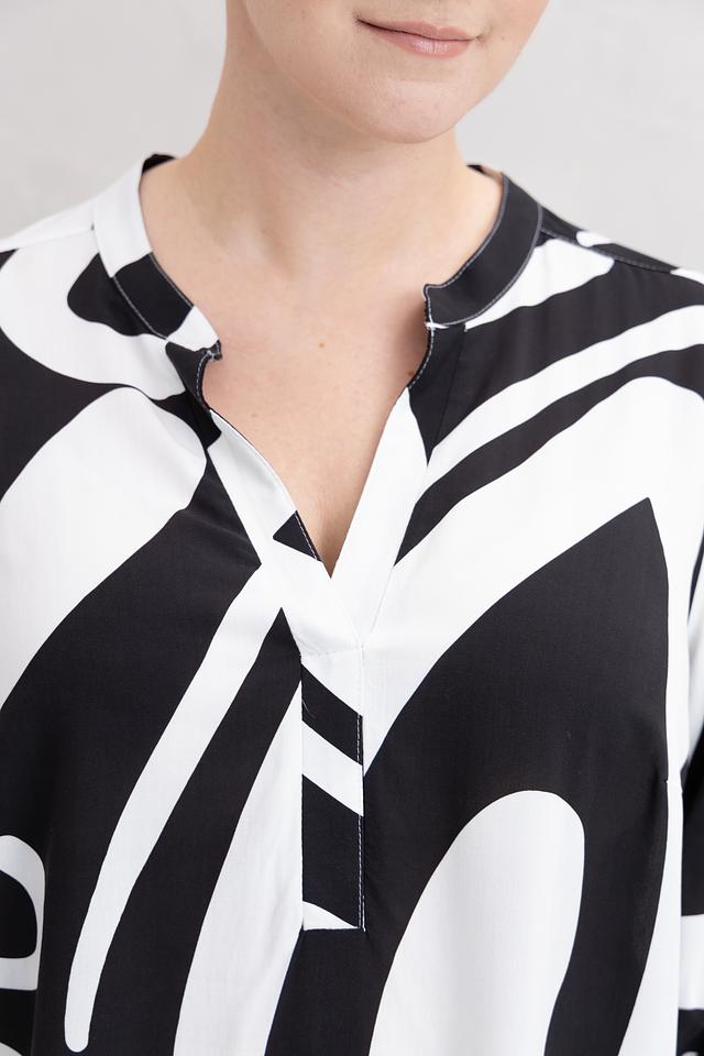 Блуза от Doris Streich чёрно-белого цвета с оригинальным абстрактным принтом. Модель выполнена из мягкой и приятной к телу вискозы, имеет V-образный вырез и короткий рукав. Состав: вискоза 100%
