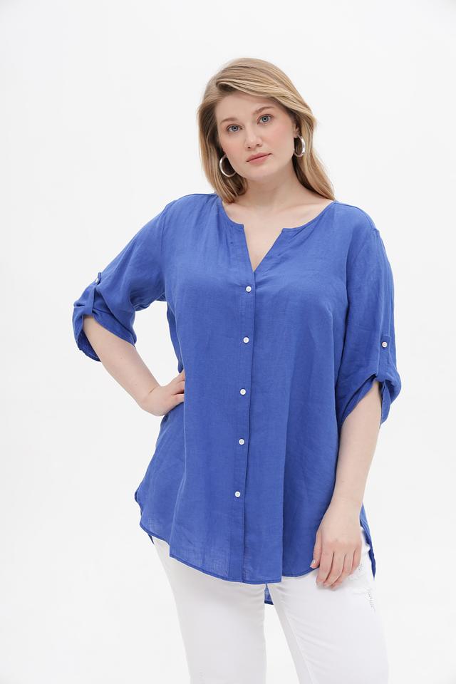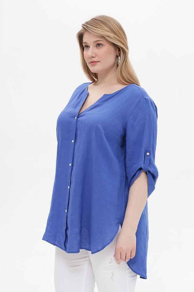 Блузка имеет свободный крой, который обеспечивает комфорт и свободу движений. V-образный вырез горловины и застёжка на пуговицы придают модели классический вид. Рукава 3/4 с небольшими складками и пуговицами добавляют изысканности.