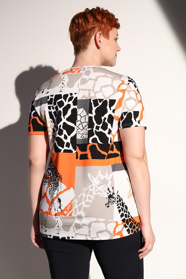 Основной цвет блузы – оранжевый, он дополнен принтом с изображением жирафов в белых и черных тонах. Принт расположен на передней части блузы, создавая интересный визуальный эффект.
