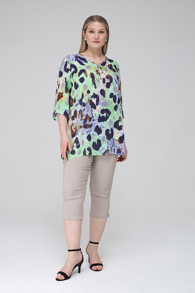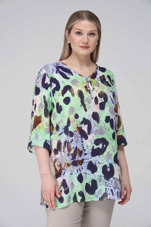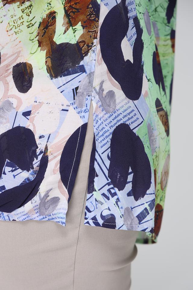 Особенностью этой блузы является ее яркий и необычный принт, сочетающий в себе абстрактные пятна, имитацию леопарда и элементы газетного текста в оттенках зеленого, фиолетового и коричневого. Застежка-молния в горловине добавляет функциональности и позволяет регулировать глубину выреза.