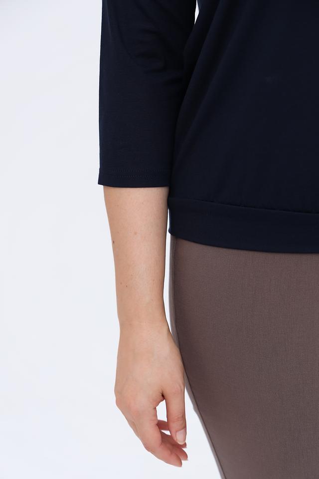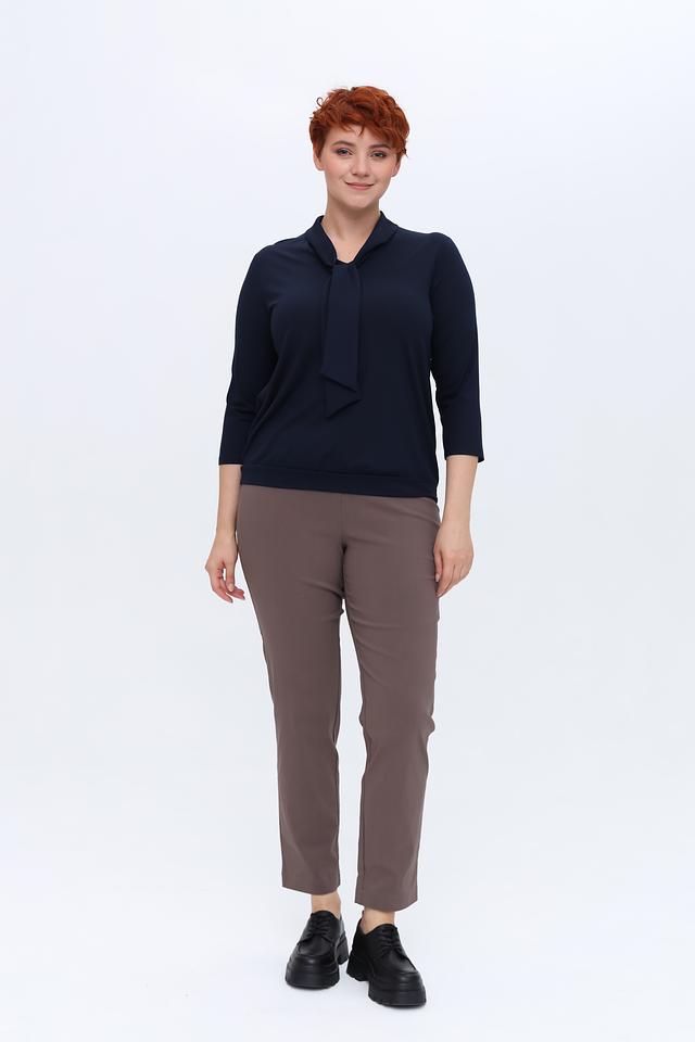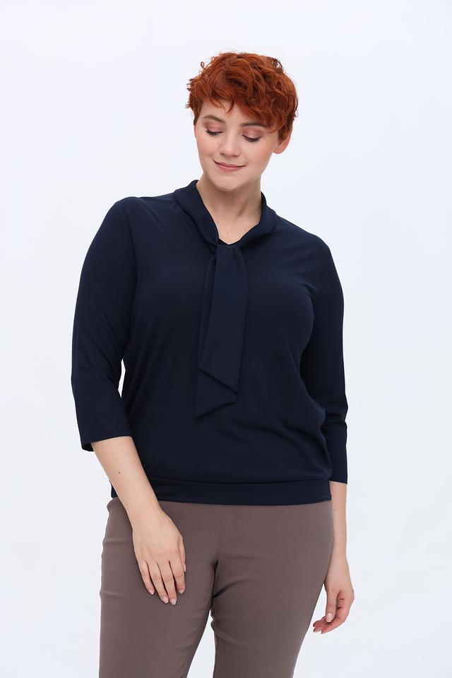 Блуза имеет классический крой с рукавом три четверти и округлым вырезом горловины, украшенным изящной завязкой. Завязка позволяет создавать различные образы, подчеркивая индивидуальность.