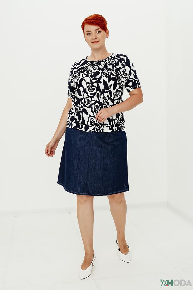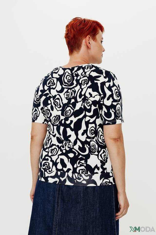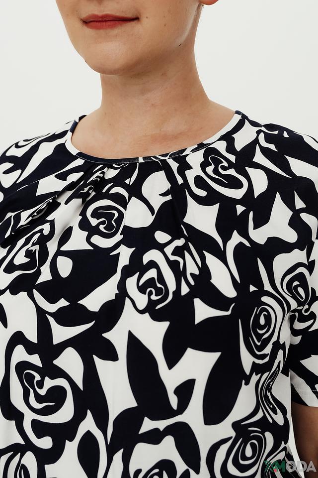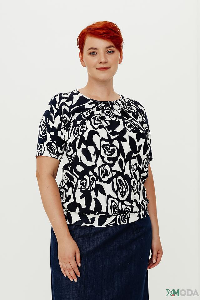Модель имеет свободный крой, который не сковывает движений и обеспечивает комфорт в течение всего дня. Короткие рукава и округлый вырез горловины делают блузу универсальной и подходящей для различных случаев.