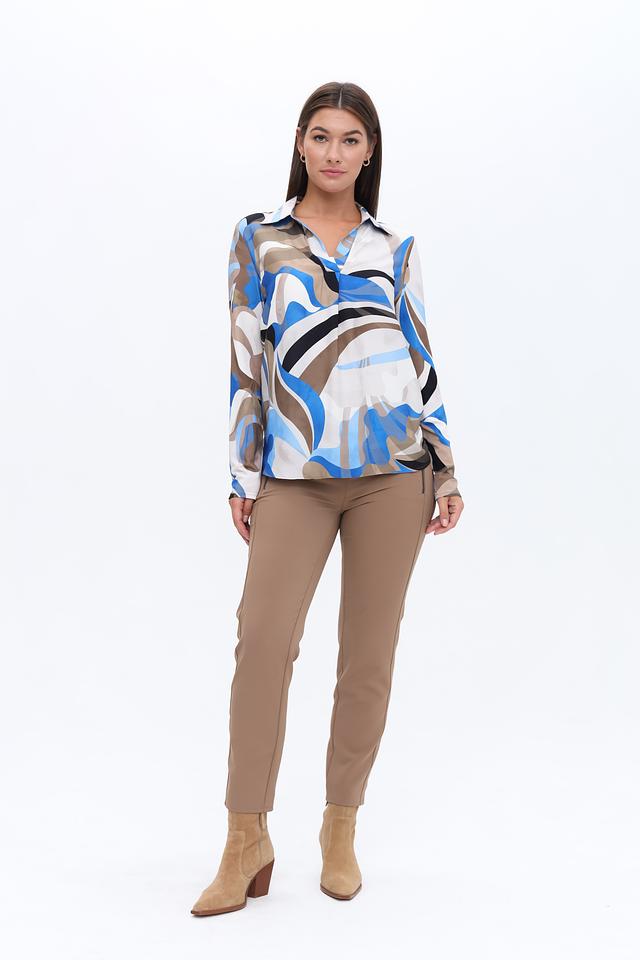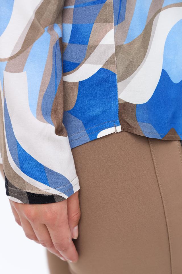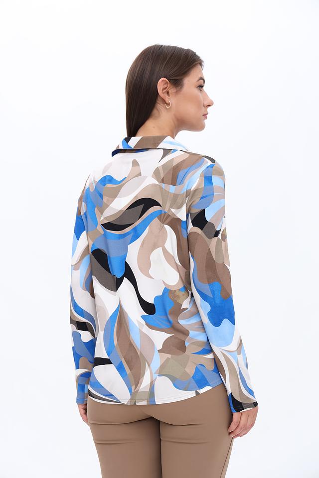 Блуза имеет классический крой с длинными рукавами и отложным воротником. Главная особенность модели – яркий абстрактный принт, сочетающий в себе оттенки синего, белого, коричневого и черного. Такой рисунок добавит образу оригинальности и индивидуальности.