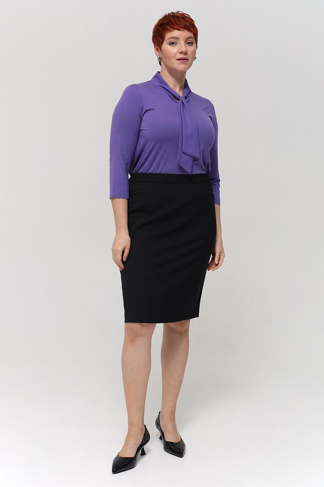 Блуза имеет лавандовый цвет и классический крой с рукавами длиной 3/4. Особый акцент сделан на воротнике, украшенном элегантным бантом, который придает образу женственность и изысканность.