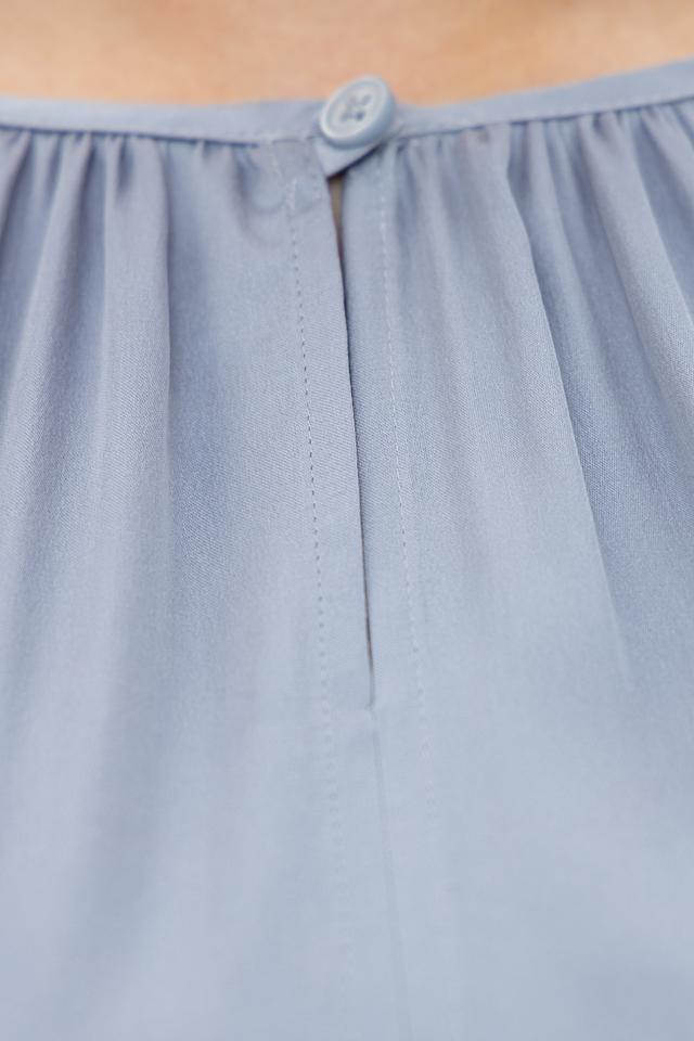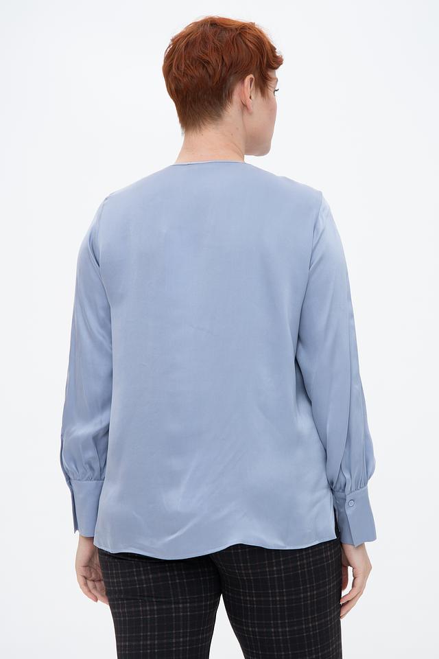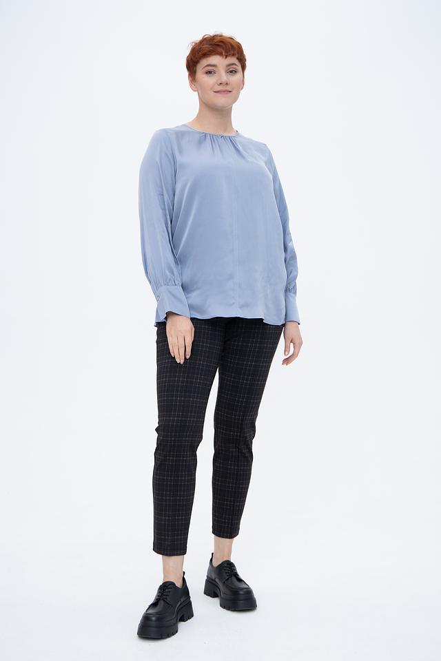 Блуза имеет нежный голубой цвет, который легко сочетается с различными элементами одежды. Округлый вырез горловины и деликатная сборка по линии плеч придают модели элегантность и женственность. Рукава-фонарики добавляют образу романтичности и легкости.