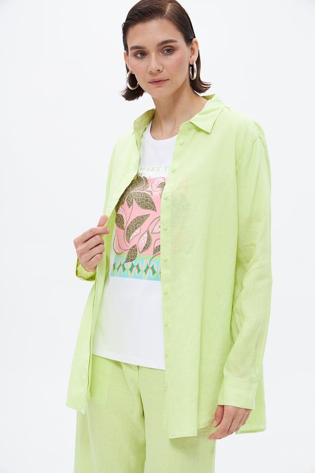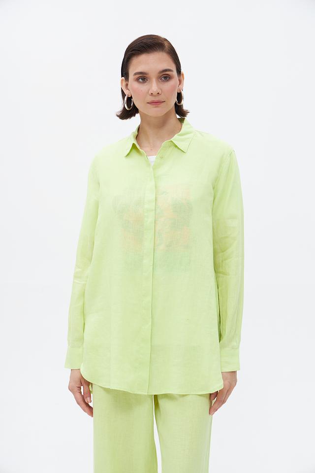 Модель выполнена в ярком лаймовом цвете, который добавит свежести и оригинальности вашему гардеробу. Блуза застегивается на ряд пуговиц в тон ткани. Длинные рукава заканчиваются манжетами с пуговицами, которые можно расстегнуть для создания более свободного силуэта.