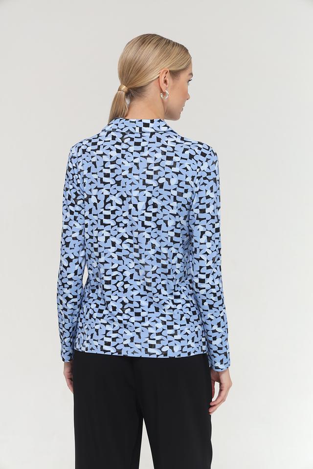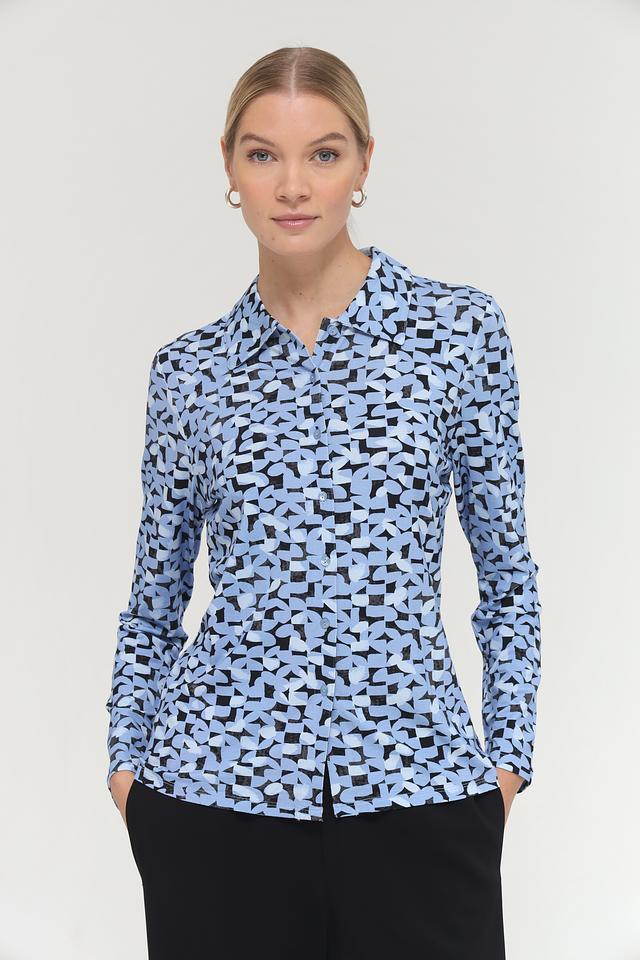 Особенностью данной модели является оригинальный геометрический принт в голубых и чёрных тонах. Классический крой с длинными рукавами и отложным воротником делает эту блузу универсальной и подходящей для различных случаев.