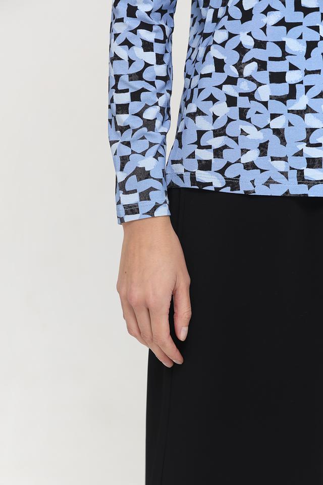 Блуза Lebek голубого цвета с оригинальным геометрическим принтом станет отличным дополнением к вашему гардеробу. Модель выполнена из мягкой вискозы с добавлением эластана, что обеспечивает комфорт и удобство в носке. Состав: вискоза 95%, эластан 5%
