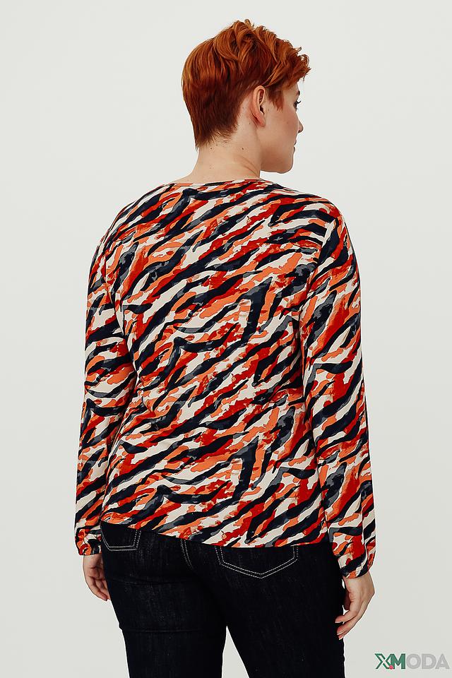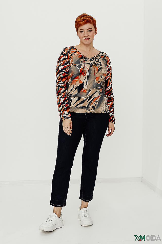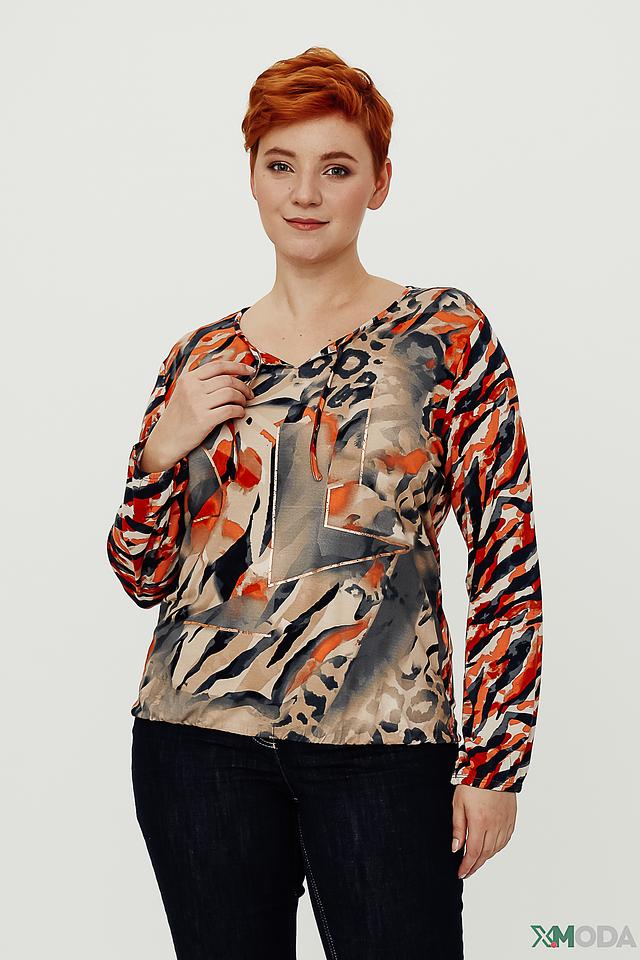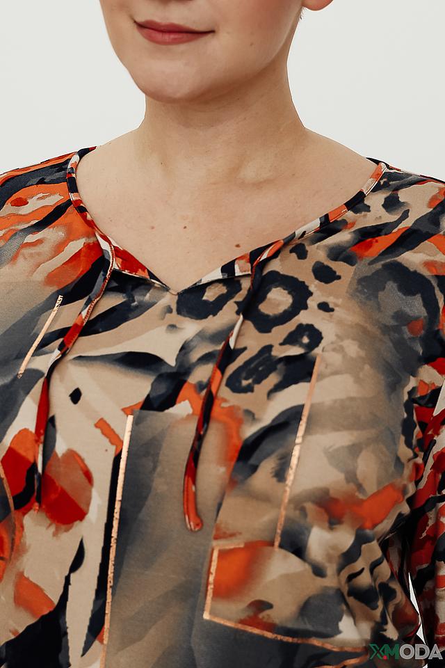 Блуза Lebek оранжево-серого цвета с ярким абстрактным принтом и V-образным вырезом. Модель с длинными рукавами и небольшим декоративным элементом в виде шнурков на груди, выполнена из мягкой и приятной к телу вискозы. Состав: вискоза 95%, эластан 5%