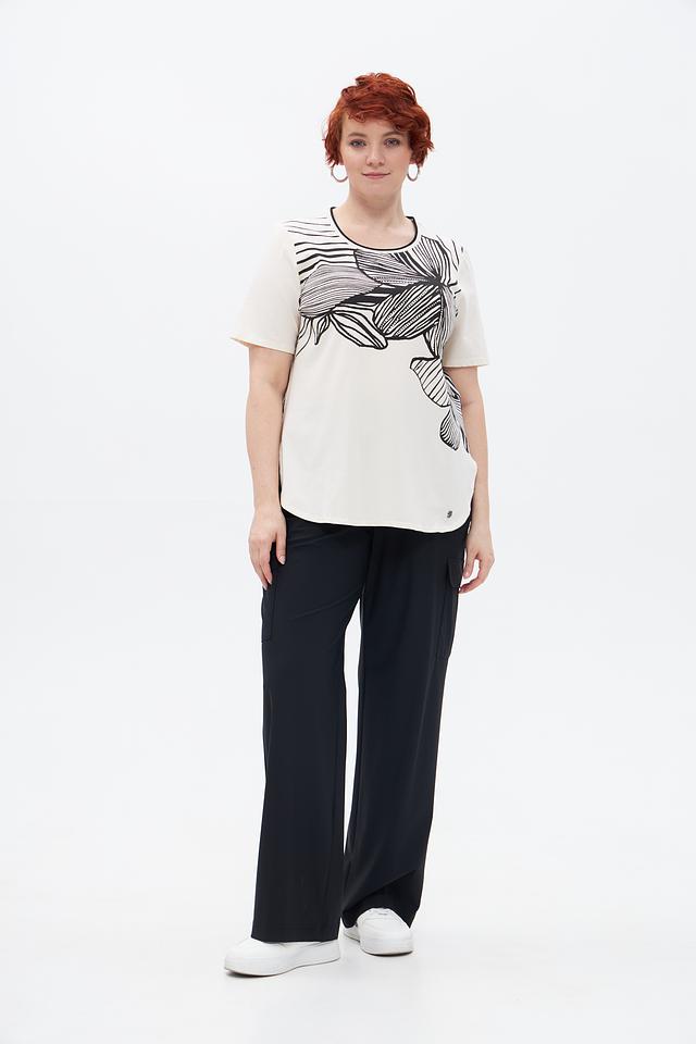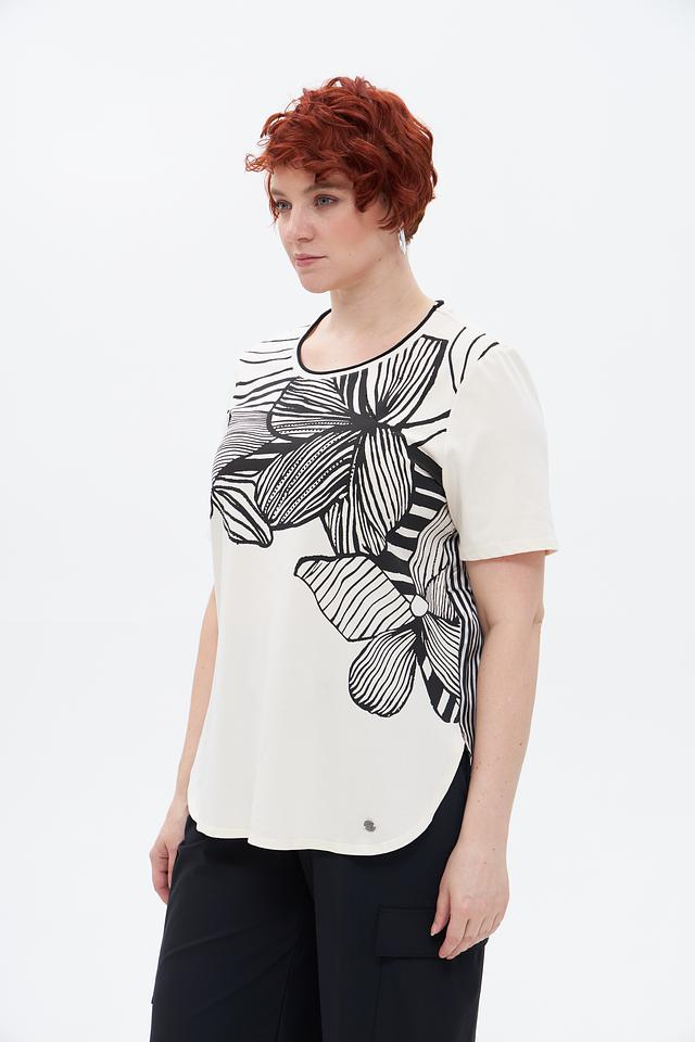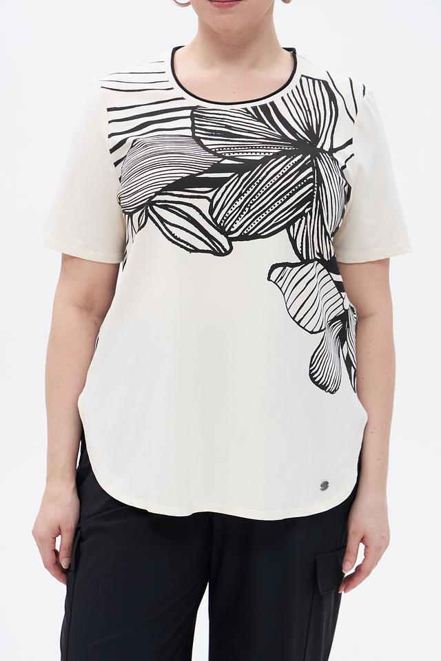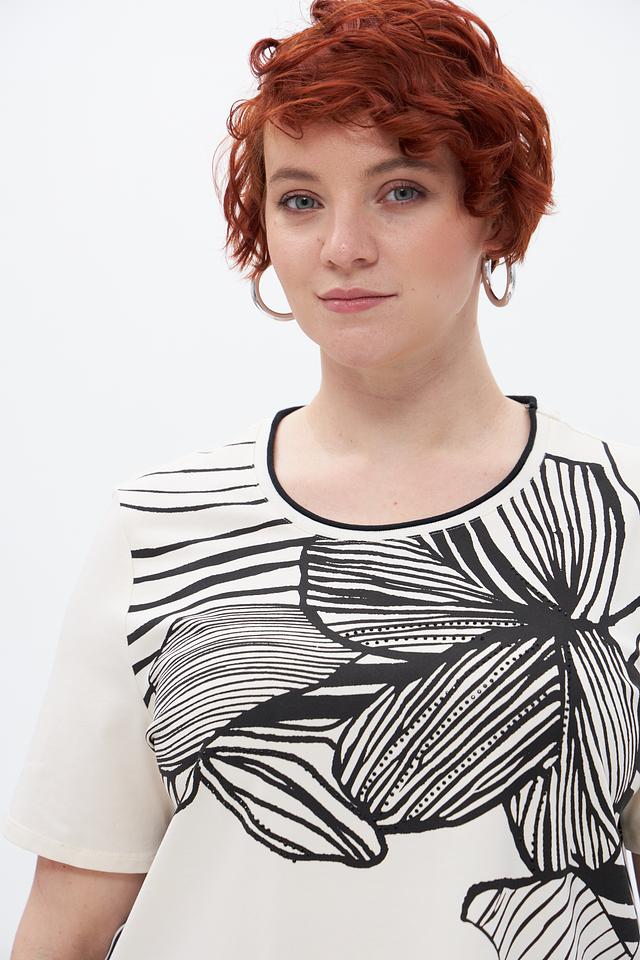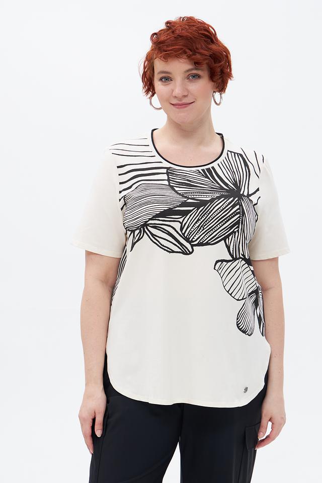 Бежевая блузка Lebek с оригинальным цветочным принтом. Изготовлена из мягкого хлопка с добавлением модала для комфорта. Свободный силуэт и короткие рукава. Состав: хлопок 95%, модал 5%