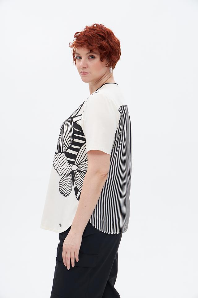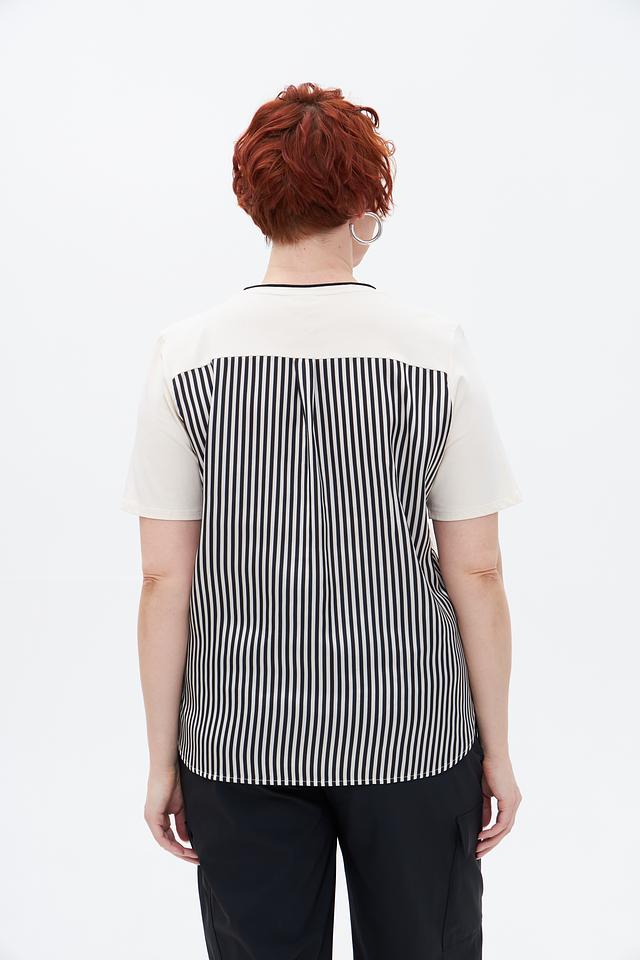 Модель имеет свободный, слегка расклешенный к низу силуэт, который обеспечивает комфорт и свободу движений. Вырез горловины – округлый, рукава – короткие. Задняя часть блузки выполнена с вертикальными полосами.