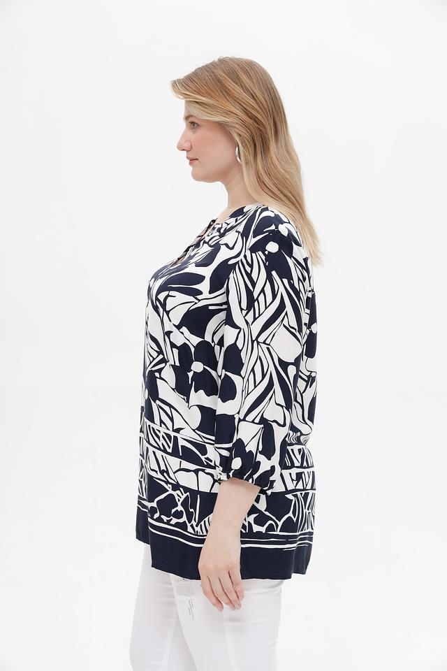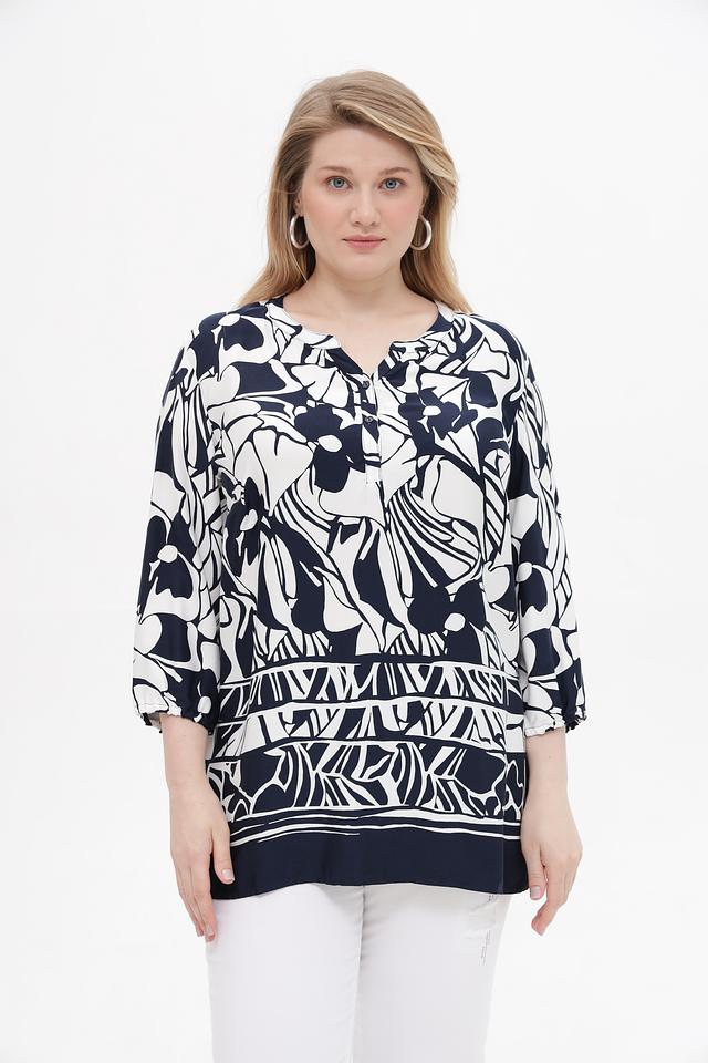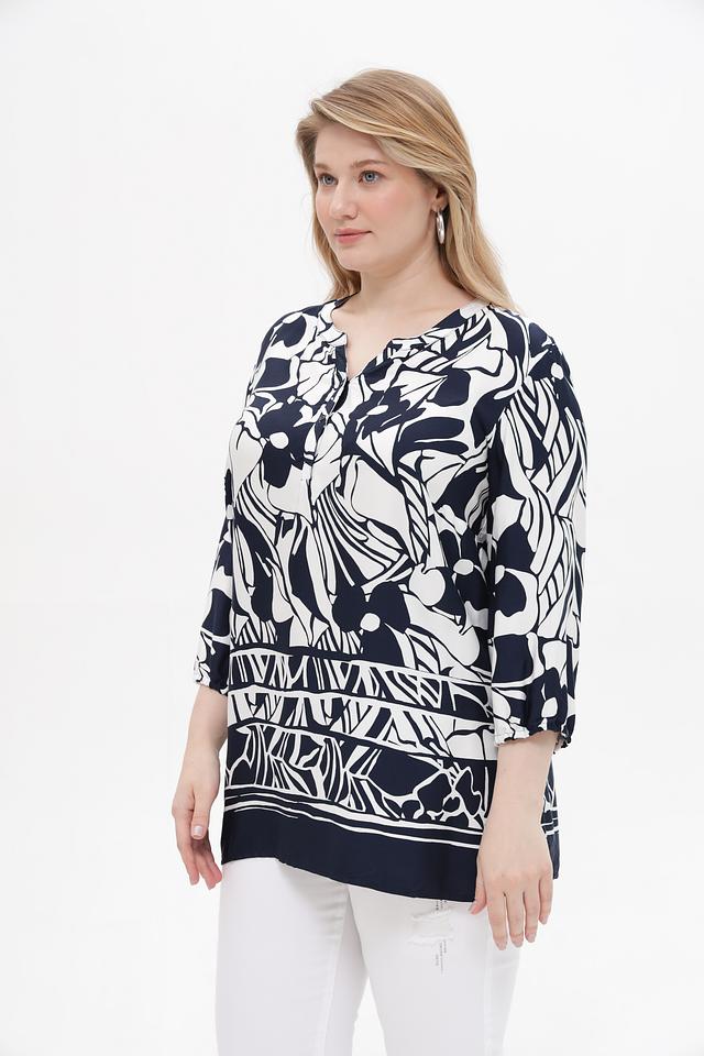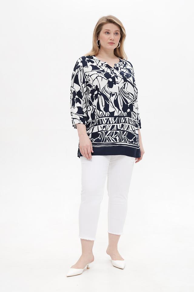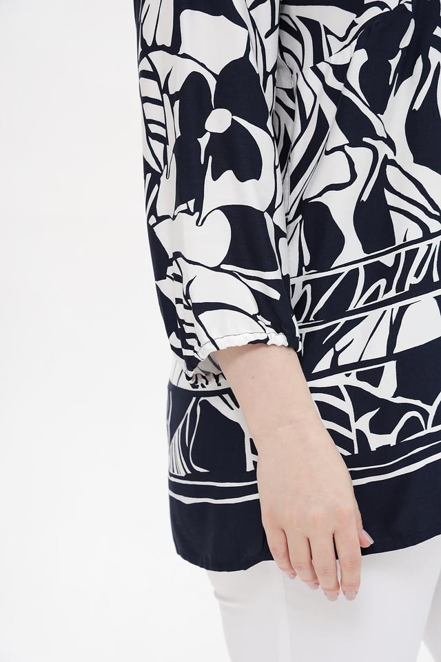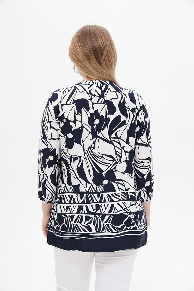 Основной цвет блузы – глубокий синий, который служит идеальным фоном для яркого цветочного принта. Принт выполнен в белоснежных тонах, что создает контрастный и эффектный образ. V-образный вырез подчеркивает линию шеи и делает блузу более женственной.