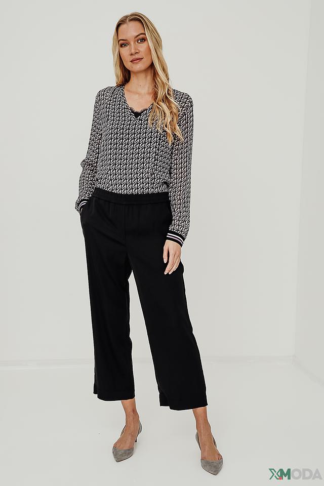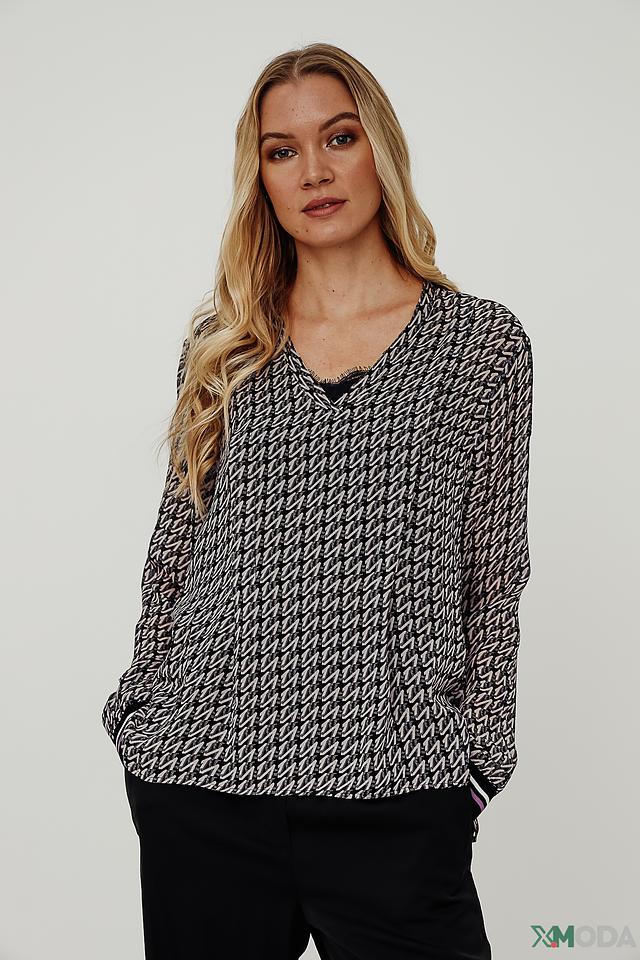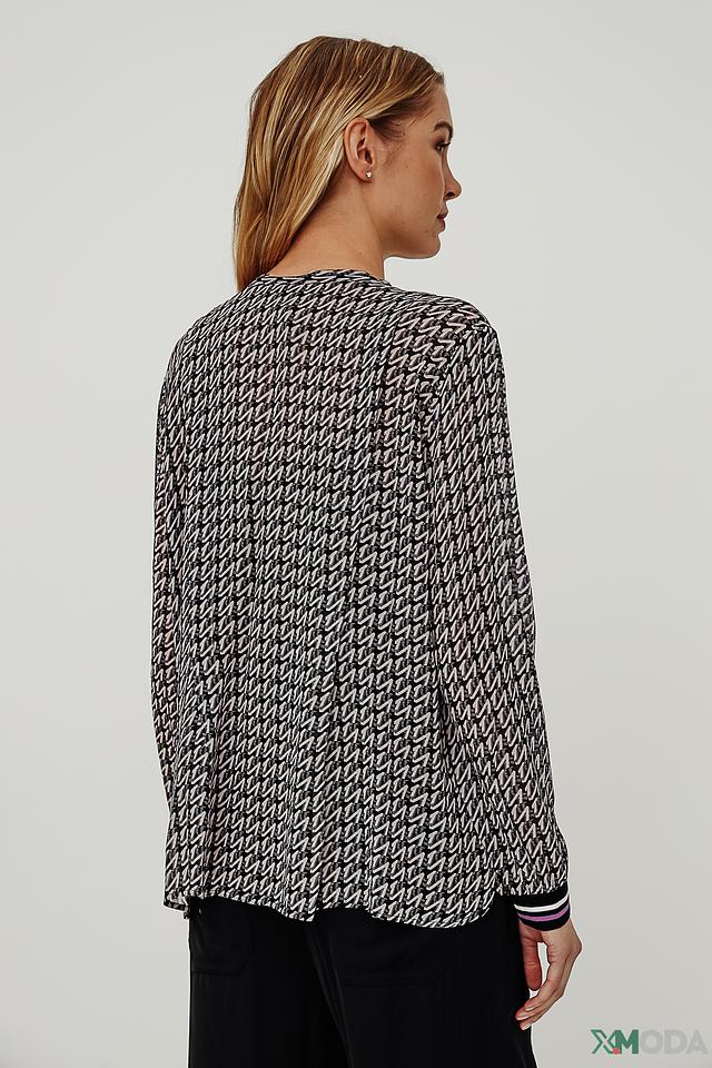 Блуза имеет свободный крой и V-образный вырез горловины. Её украшает стильный геометрический принт в чёрно-белой гамме, который придаёт ей изысканность и современный вид. Длинные рукава дополнены манжетами с контрастной полоской.