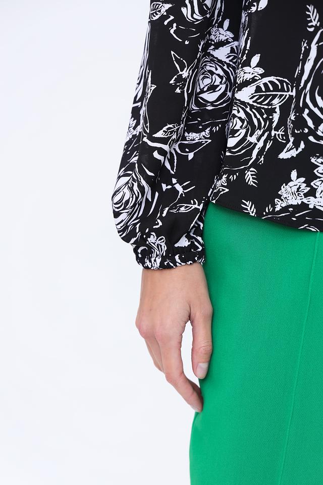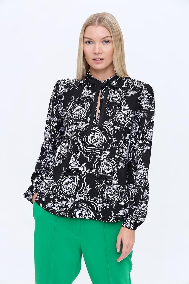 Модель имеет длинные рукава с манжетами и V-образный вырез, который акцентируется тонкими завязками, позволяющими регулировать глубину декольте. Блуза выполнена из высококачественного полиэстера, что обеспечивает комфорт в носке и лёгкость ухода.