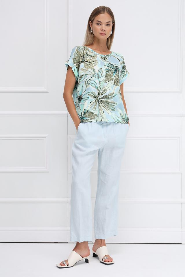 Эта стильная блуза от Monari выполнена в светло-голубой цветовой гамме и украшена эффектным цветочным принтом, состоящим из оттенков зеленого и коричневого. Блуза имеет свободный крой, который обеспечивает комфортную посадку по фигуре.