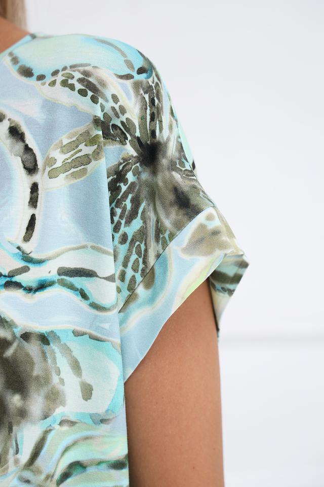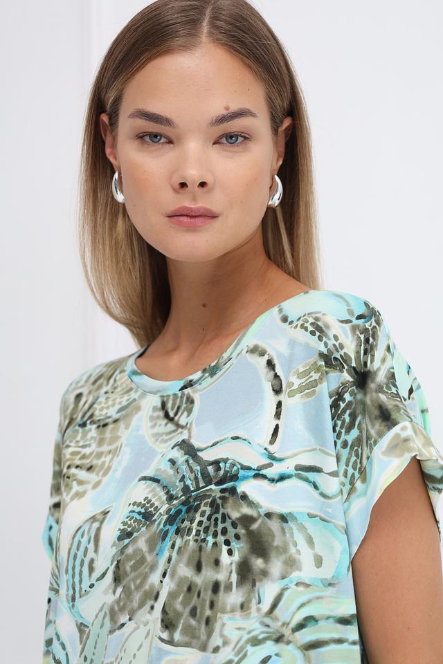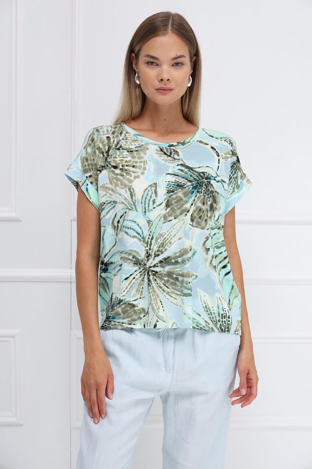 Модель выполнена из высококачественной вискозы с добавлением эластана (95% вискоза, 5% эластан), что делает ее приятной на ощупь и обеспечивает хорошую драпировку. Короткие рукава и округлый вырез горловины придают блузе легкий и непринужденный вид.