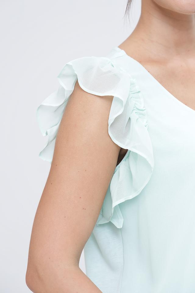 Модель имеет округлый вырез горловины и короткие рукава, украшенные воланами. Воланы добавляют блузе женственности и изящества. Спереди по центру блузы расположена небольшая сборка, формирующая мягкие складки.