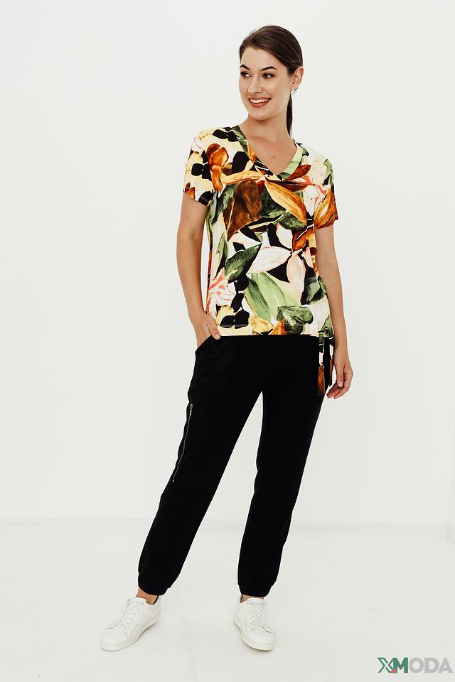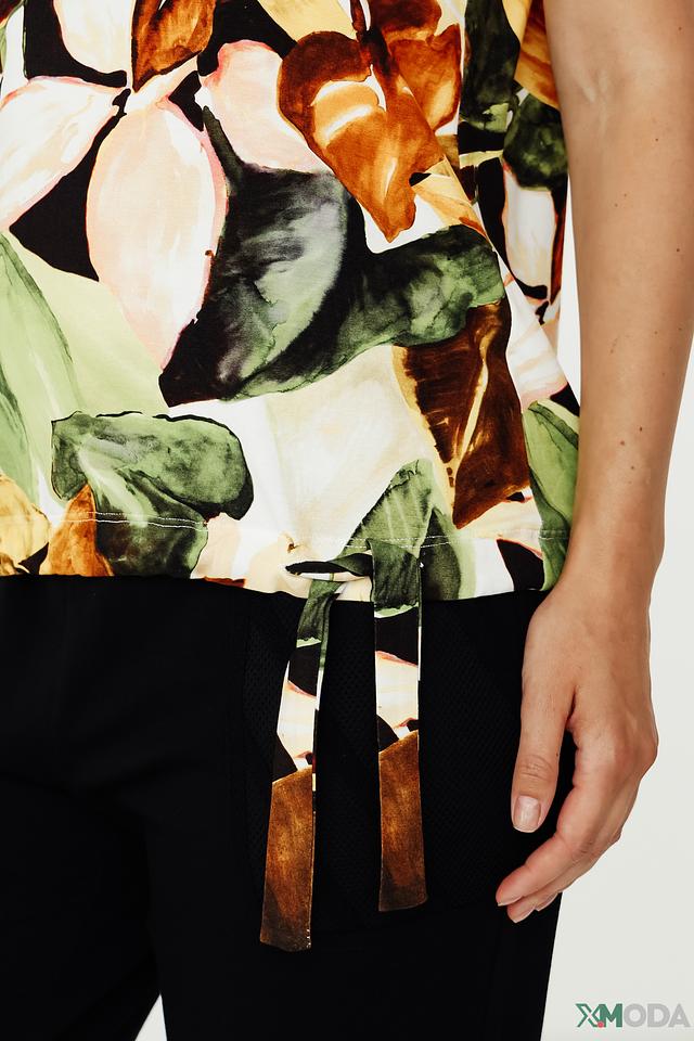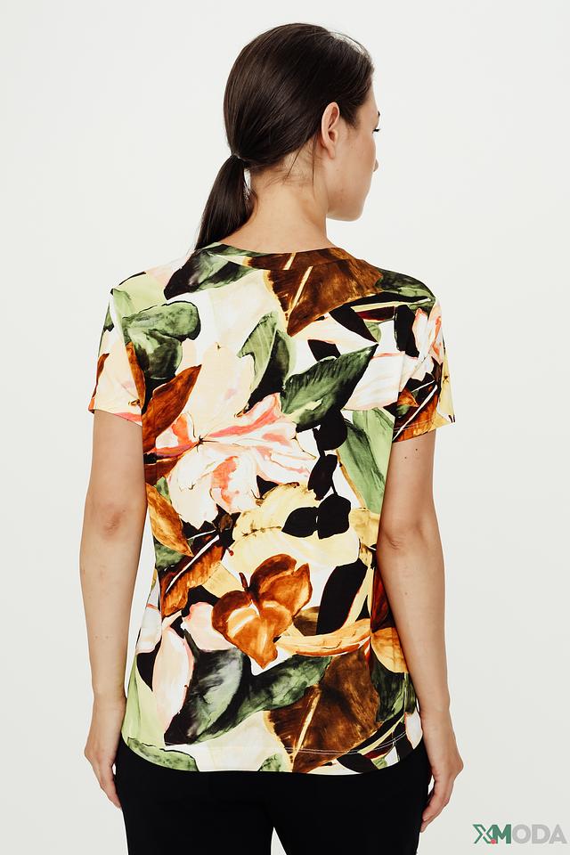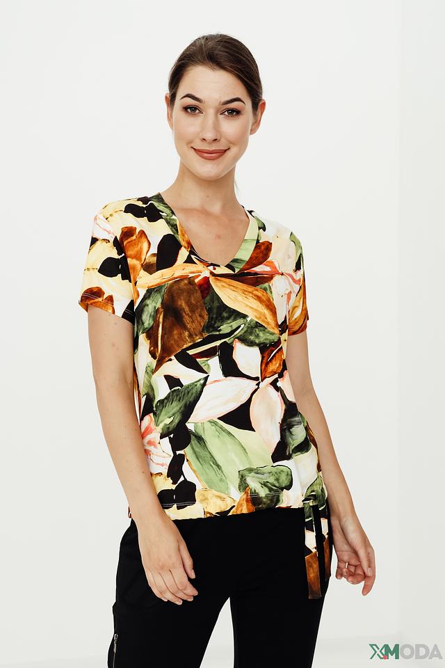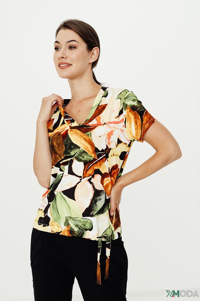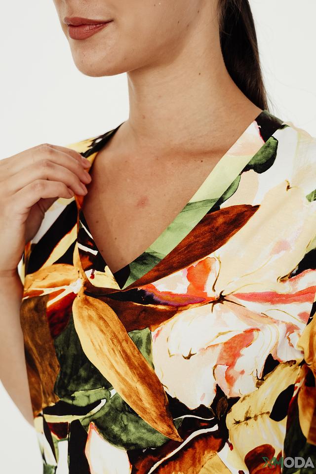 Блуза имеет V-образный вырез и короткие рукава. Ее украшает эффектный цветочный принт, выполненный в разнообразных оттенках зеленого, коричневого, желтого и бежевого. Свободный крой обеспечивает комфорт при движении.