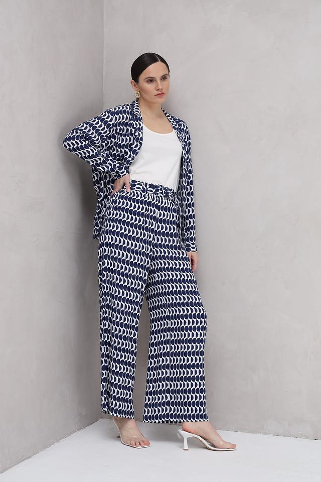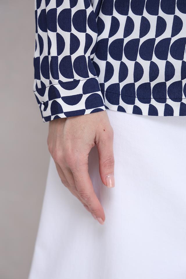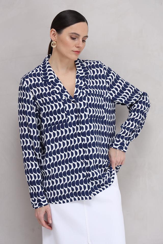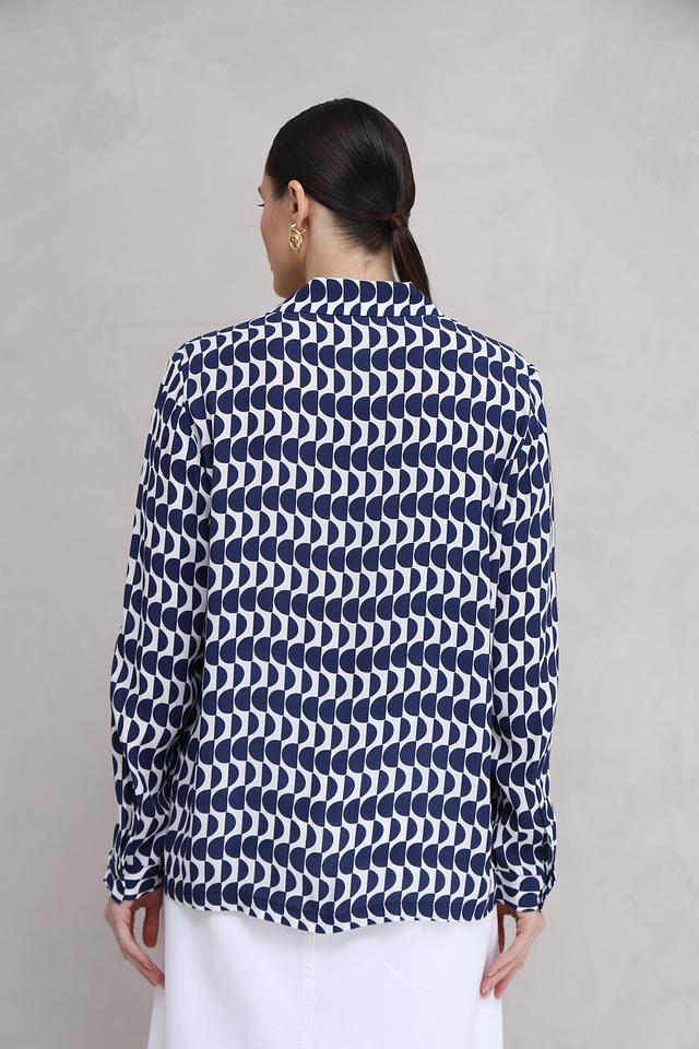 Особенностью данной модели является яркий геометрический принт в синих и белых тонах, который придает блузе оригинальность и выразительность. Классический крой с V-образным вырезом и длинными рукавами делает ее универсальной и подходящей для различных случаев.