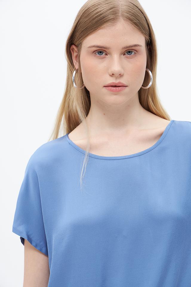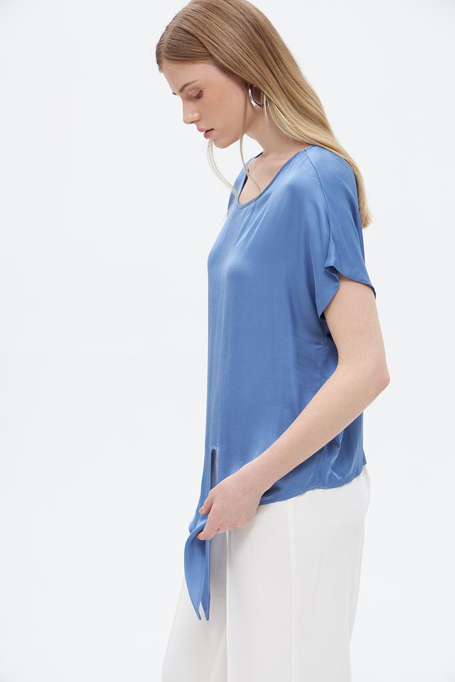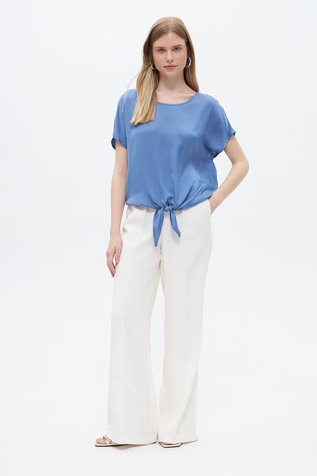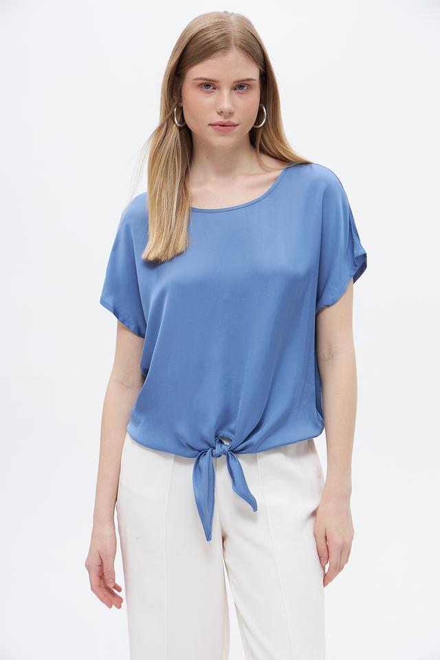 Модель имеет короткие рукава и округлый вырез горловины. Особенностью блузы является завязка на талии, которая позволяет подчеркнуть фигуру и создать более женственный силуэт.