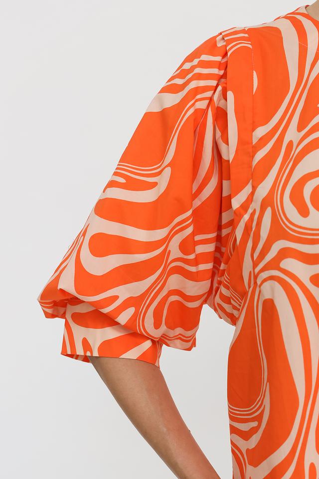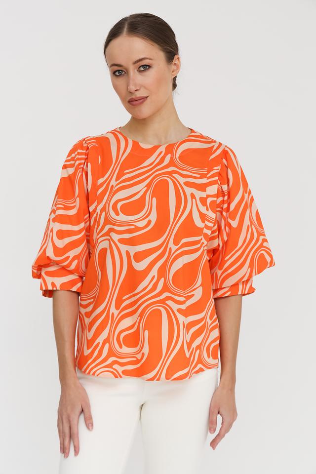 Особенностью данной модели является оригинальный волнистый принт оранжевого и бежевого цветов, который привлекает внимание и подчеркивает индивидуальность. Блуза идеально сочетается с брюками, юбками и джинсами, позволяя создавать разнообразные стильные образы.