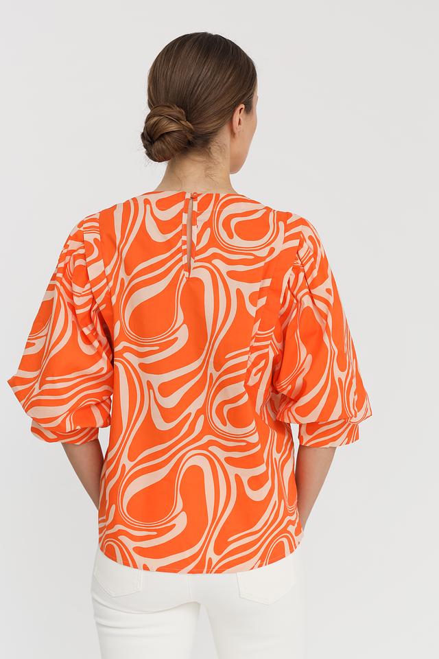 Блуза Oui оранжевого цвета с оригинальным волнистым принтом и рукавами-фонариками. Изготовлена из 100% хлопка, обеспечивающего комфорт и воздухопроницаемость. Стильный и яркий выбор для создания неповторимого образа. Состав: хлопок 100%