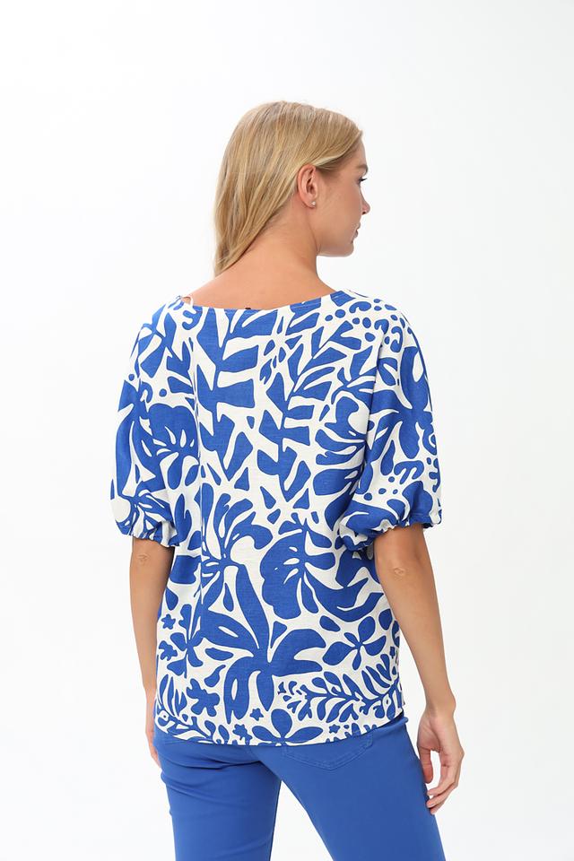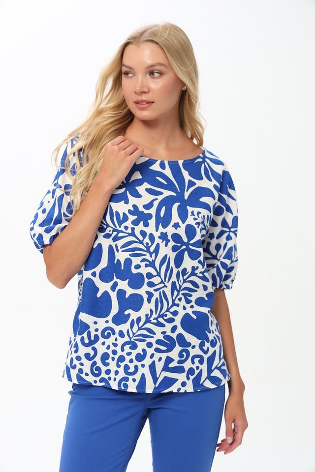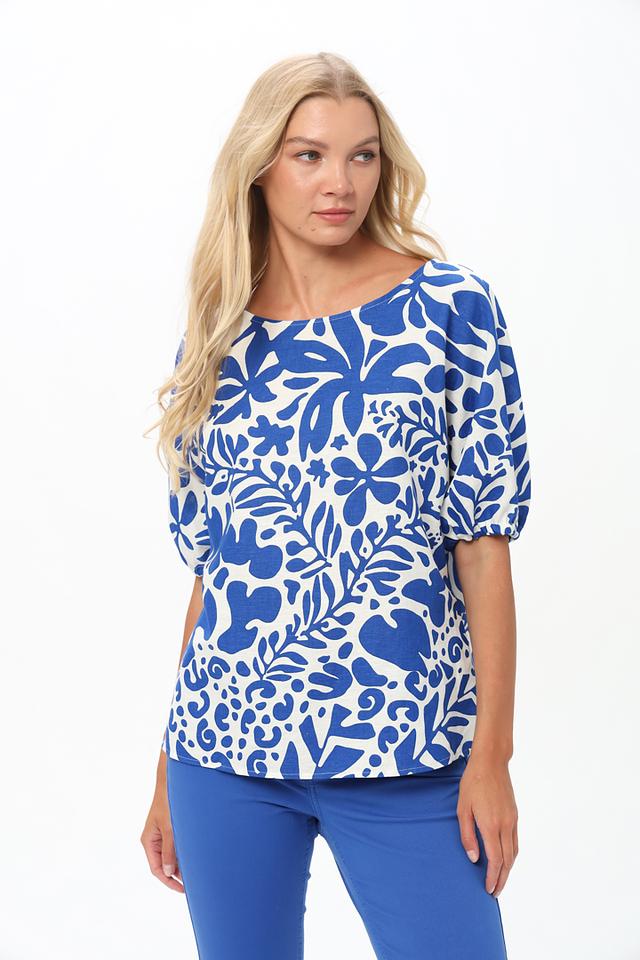 Блуза имеет свободный крой и короткие рукава с небольшими сборками, что обеспечивает комфорт и свободу движений. Вырез горловины – округлый, что делает модель универсальной и подходящей для различных типов фигуры.