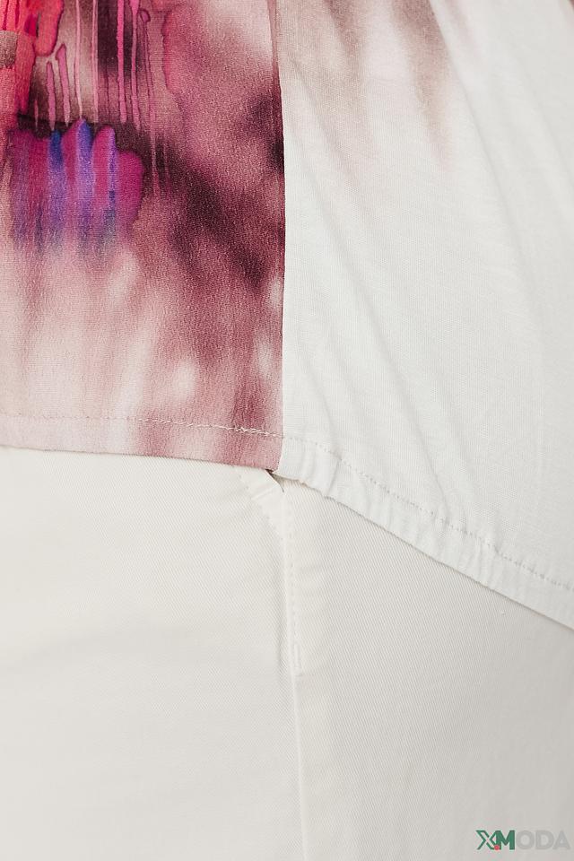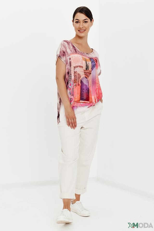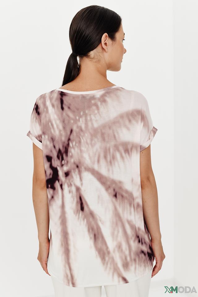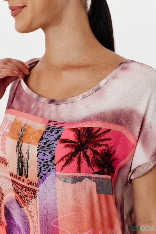Блуза имеет свободный крой и короткие рукава, что делает ее идеальной для теплой погоды. Основной цвет блузы – нежно-розовый, а главным акцентом является красочный принт с изображением пейзажа, включающий элементы пустыни, пальм и архитектурных сооружений.