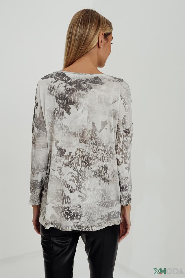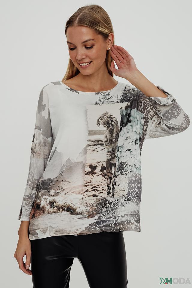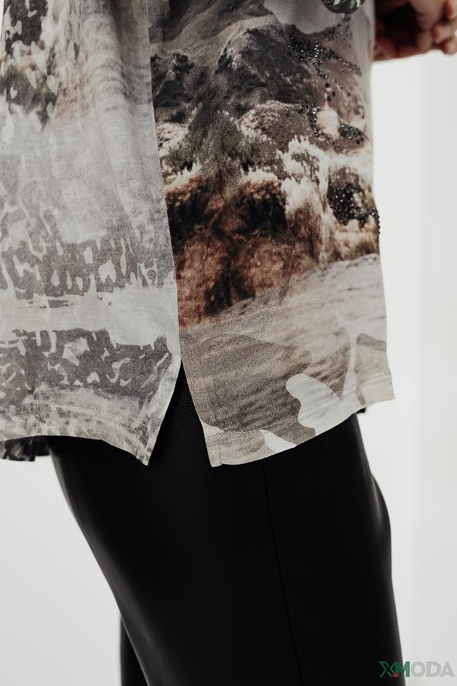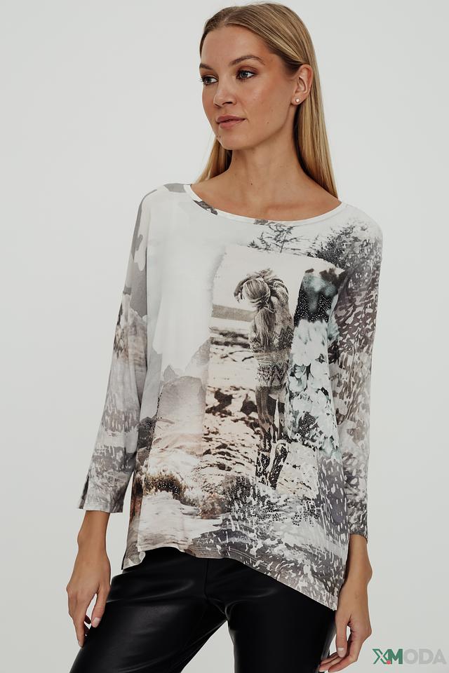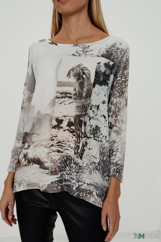 Основной цвет блузы – белый, но она украшена эффектным принтом с изображением лошадей в серо-коричневых тонах. Принт выполнен в стиле акварели, что придает блузе особую изысканность и художественность.