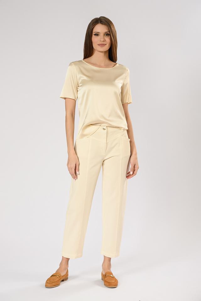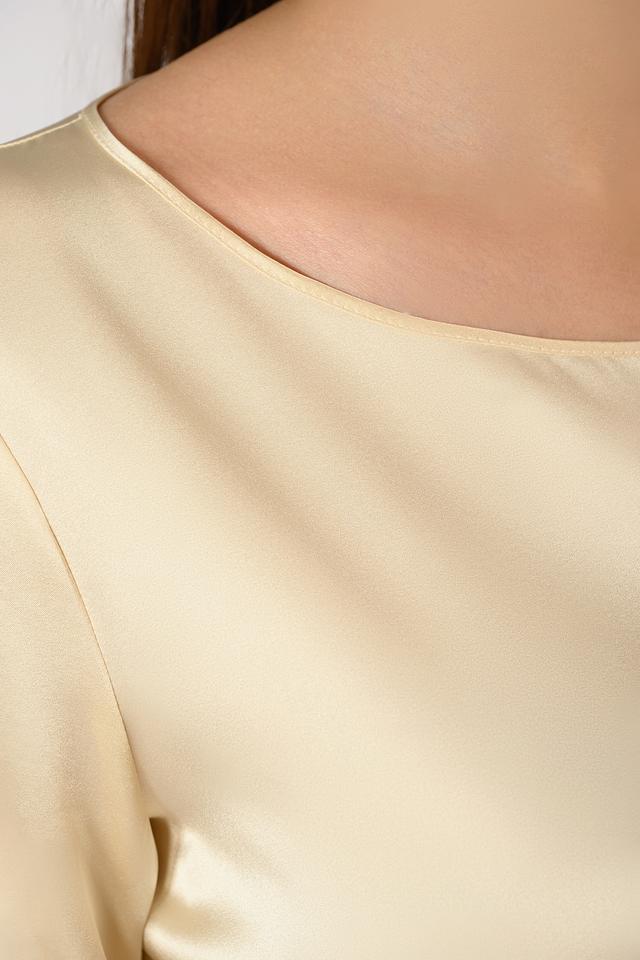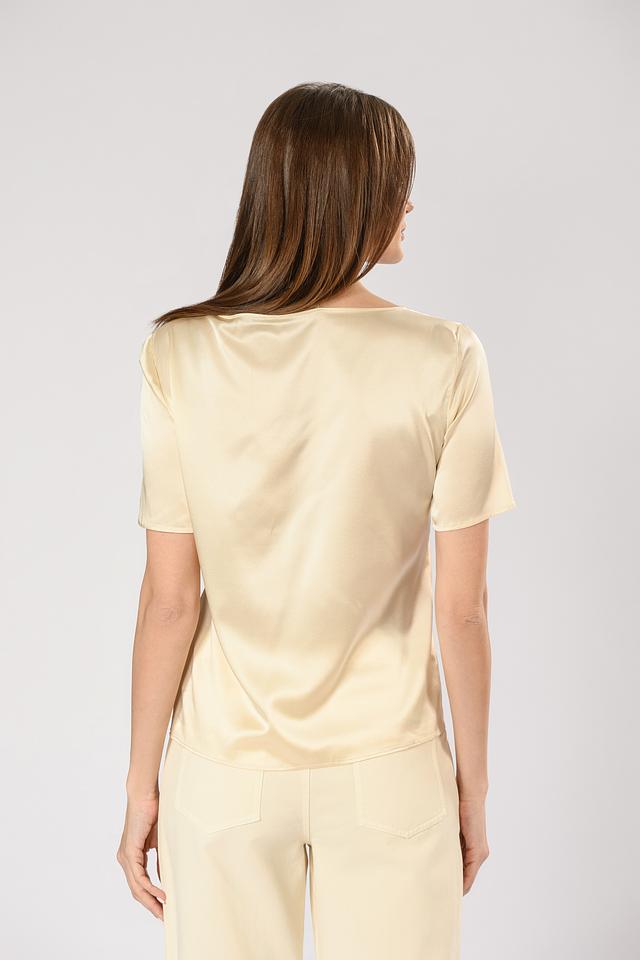 Округлый вырез горловины и короткие рукава делают эту модель идеальной для тёплой погоды. Ткань обладает лёгким блеском, придающим блузе изысканный вид. Бежевый цвет делает блузу универсальной и легко сочетаемой с различными элементами гардероба.