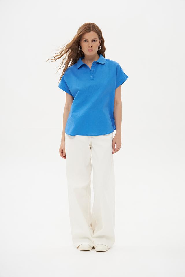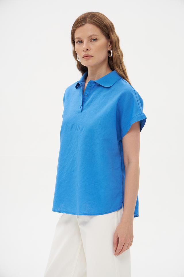 Голубая блуза Pezzo с короткими рукавами и воротником-поло станет отличным дополнением к вашему гардеробу. Изготовлена из натурального льна и хлопка, обеспечивая комфорт и воздухопроницаемость. Состав: лен 55%, хлопок 45%