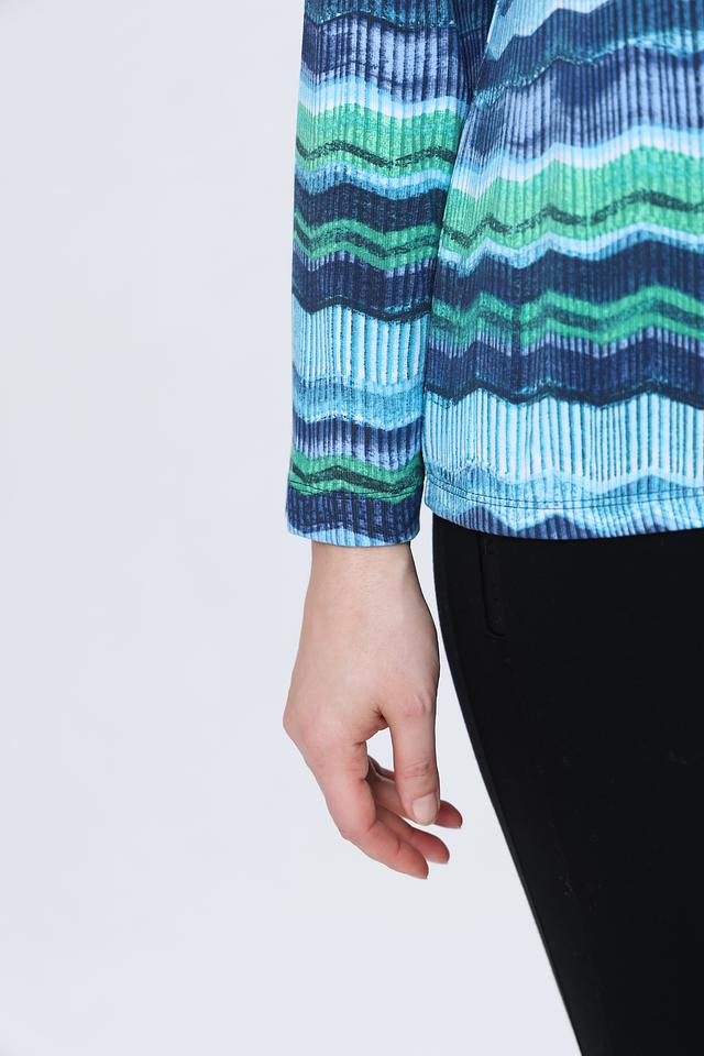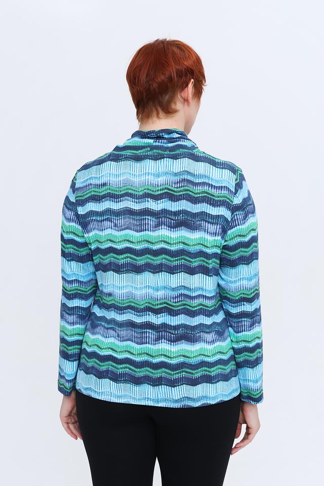 Блуза Rabe collection бирюзового цвета с оригинальным полосатым принтом и высоким воротником-стойкой. Изготовлена из мягкой вискозы с добавлением эластана для комфорта и хорошей посадки. Состав: вискоза 94%, эластан 6%