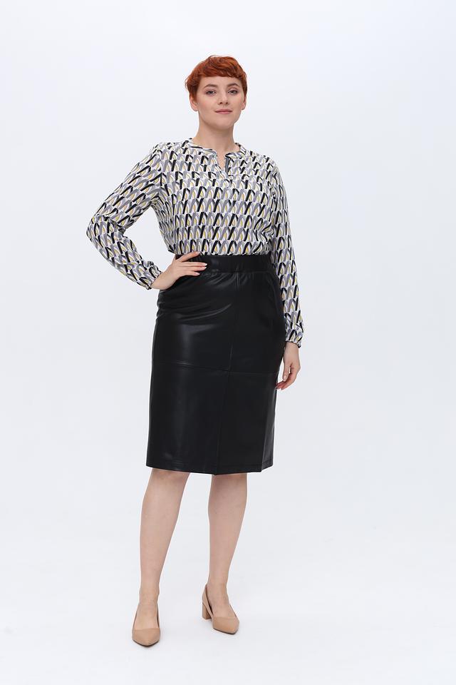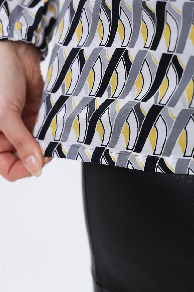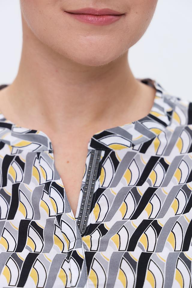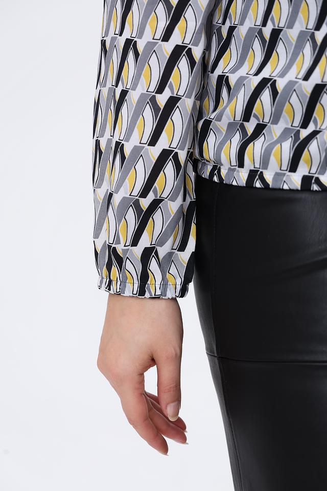 Эта блуза от Rabe collection – отличный выбор для создания элегантного и современного образа. Блуза выполнена в белом цвете и украшена ярким геометрическим принтом, сочетающим в себе оттенки жёлтого, серого и чёрного.