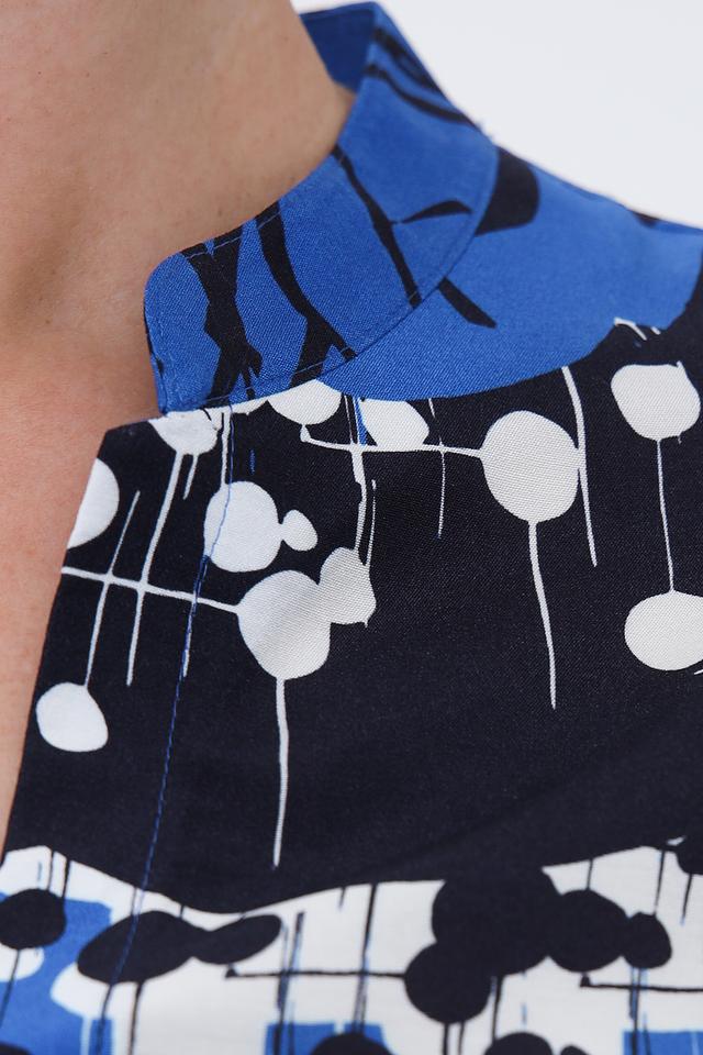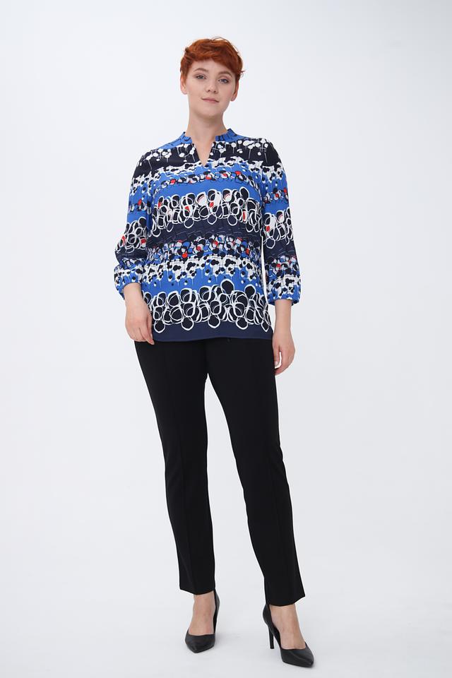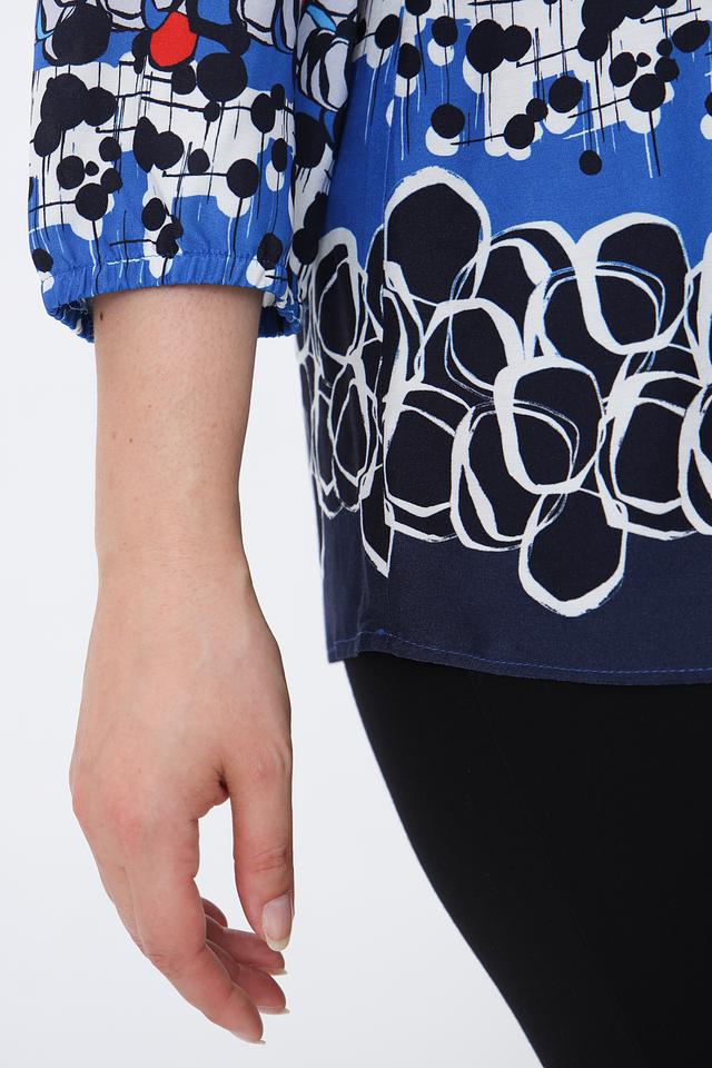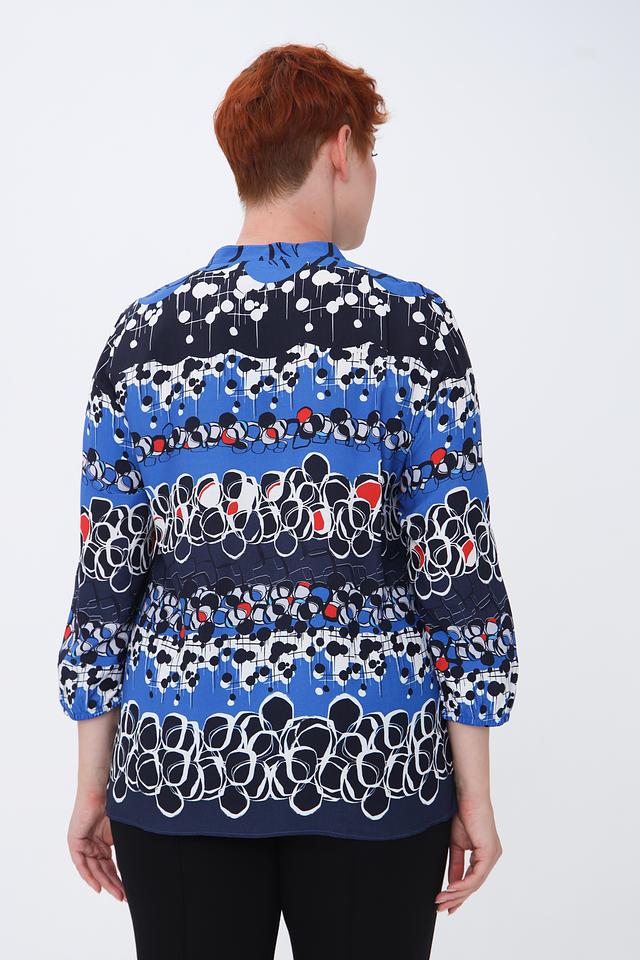 Эта блуза от Rabe collection – отличный выбор для создания элегантного и комфортного образа. Блуза выполнена в насыщенном синем цвете и украшена ярким геометрическим принтом, состоящим из черных, белых и красных элементов.