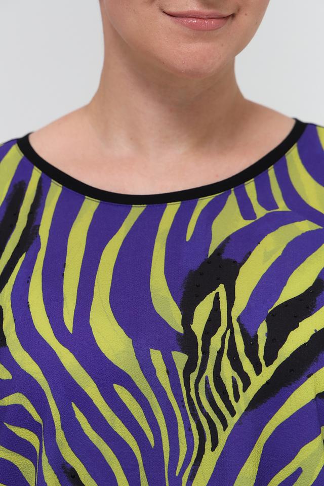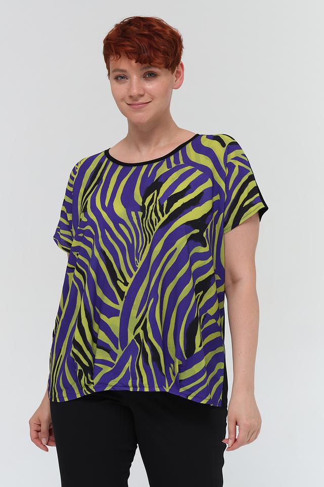 Блуза имеет свободный крой, короткие рукава и округлый вырез горловины. Главная особенность модели – эффектный принт в виде зебры, выполненный в сочетании фиолетовых, зелёных и чёрных оттенков. Такой рисунок добавит динамики и оригинальности вашему образу.