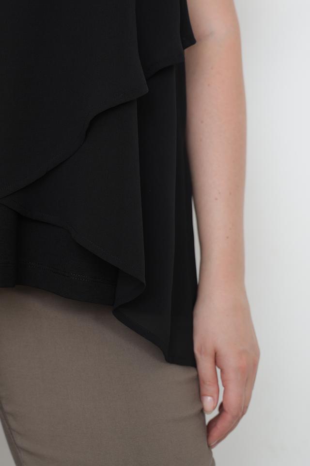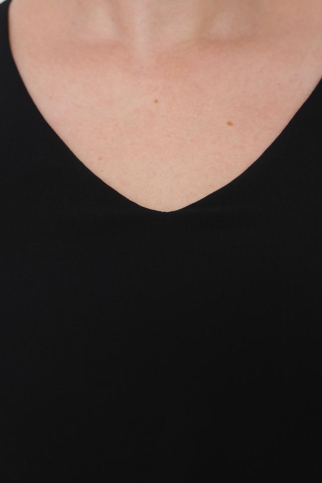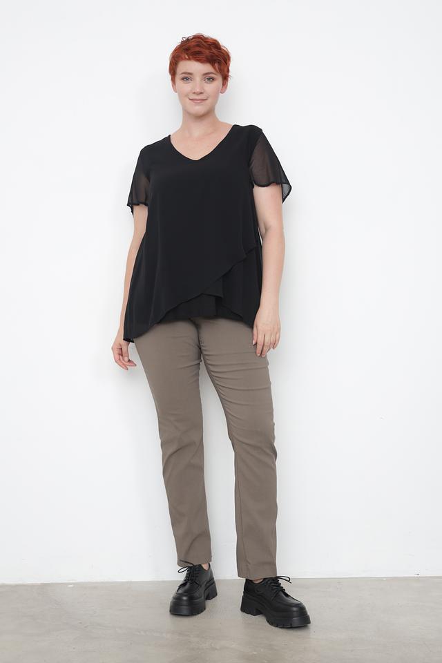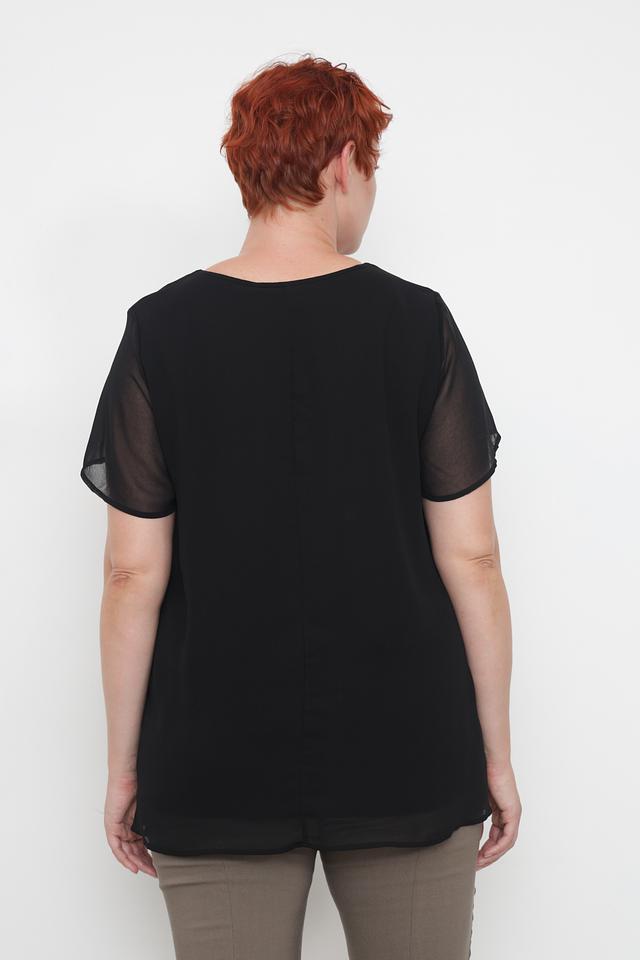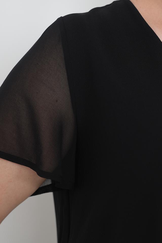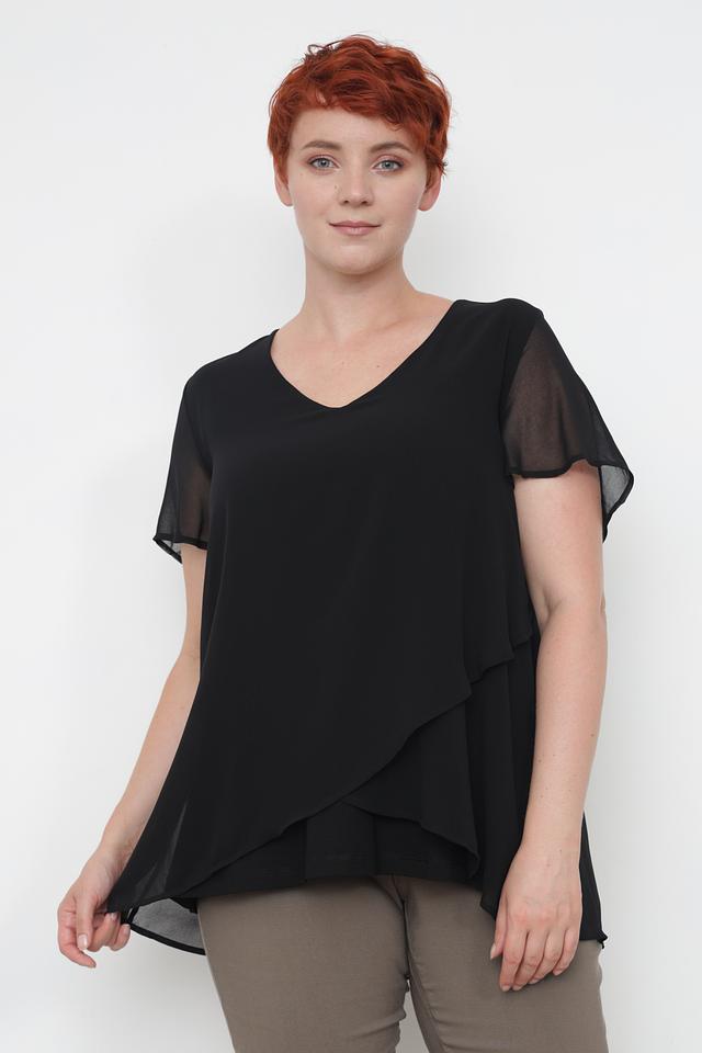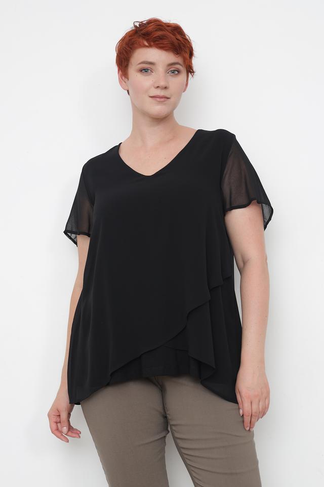 Чёрная блуза Samoon свободного кроя с V-образным вырезом и асимметричным запахом. Модель выполнена из лёгкой ткани и дополнена короткими рукавами из полупрозрачного материала. Состав: полиэстер 100%