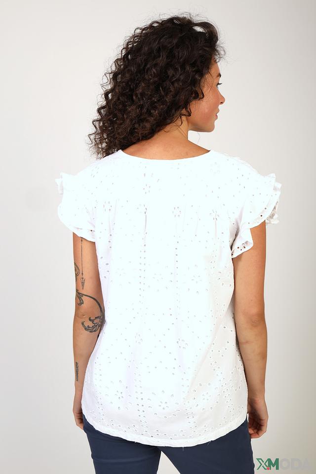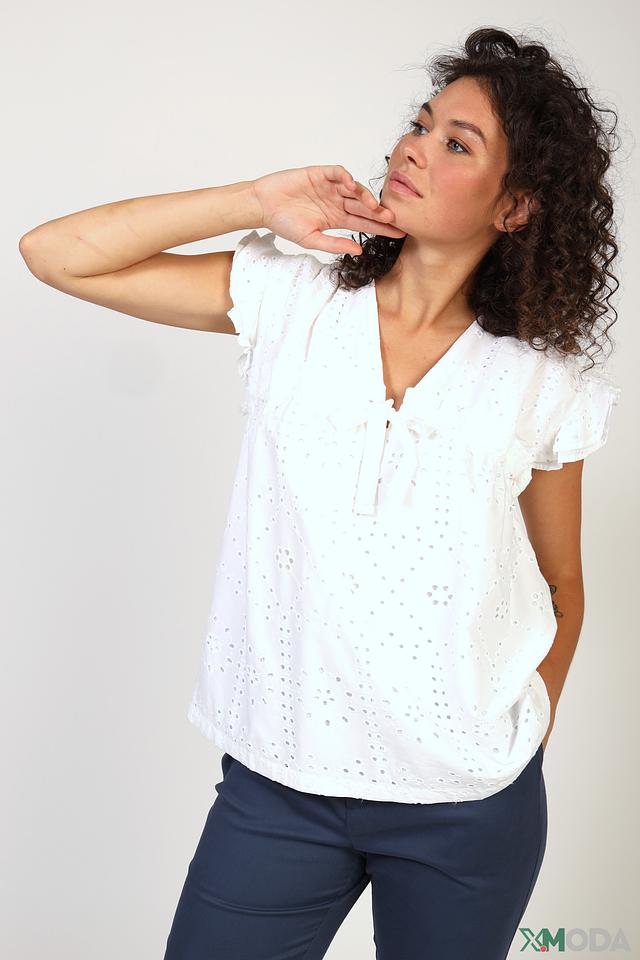 Блуза имеет свободный крой, который обеспечивает комфорт в носке. V-образный вырез горловины дополнен завязками, позволяющими регулировать глубину и создавать различные образы. Короткие рукава с воланами добавляют женственности.