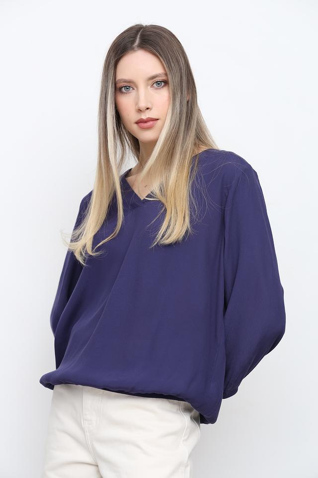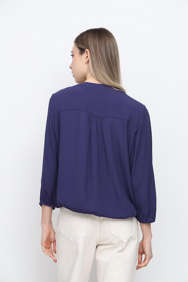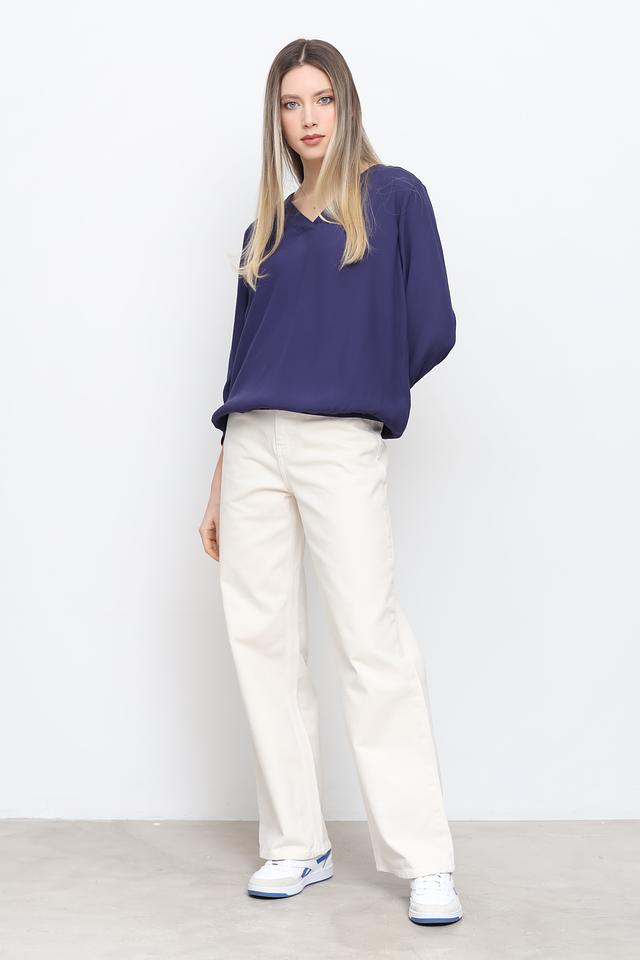 Блуза имеет классический V-образный вырез, который визуально удлиняет шею и делает образ более изящным. Рукава длиной 3/4 с манжетами добавляют аккуратности и завершенности. Свободный крой не сковывает движений и позволяет создать расслабленный, но при этом стильный образ.