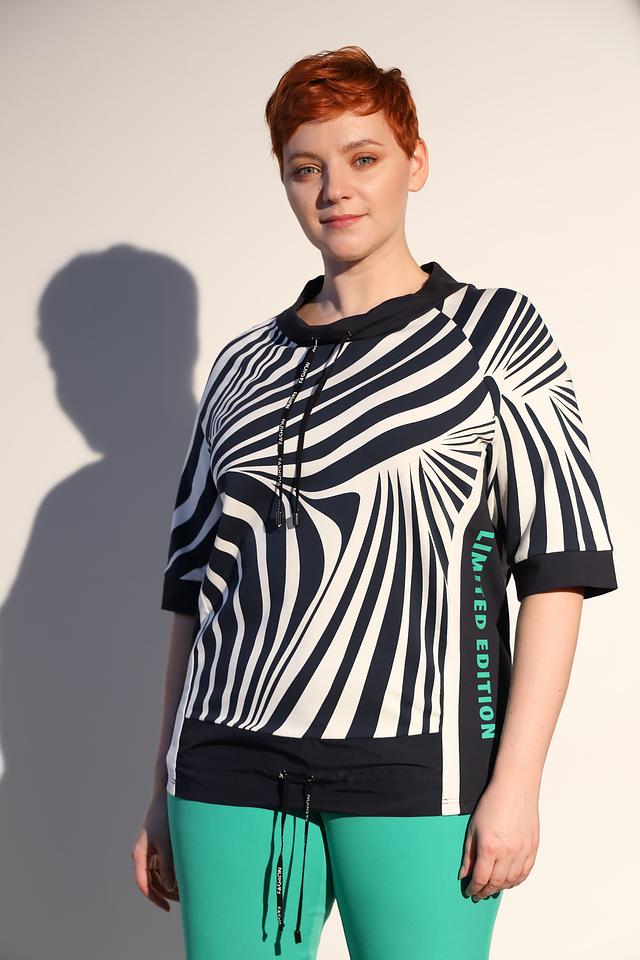 Блуза Tuzzi в стильную полоску сине-белого цвета с коротким рукавом и округлым вырезом горловины. Модель дополнена шнурками и надписью "Limited Edition". Изготовлена из мягкого хлопка с добавлением эластана. Состав: хлопок 95%, эластан 5%