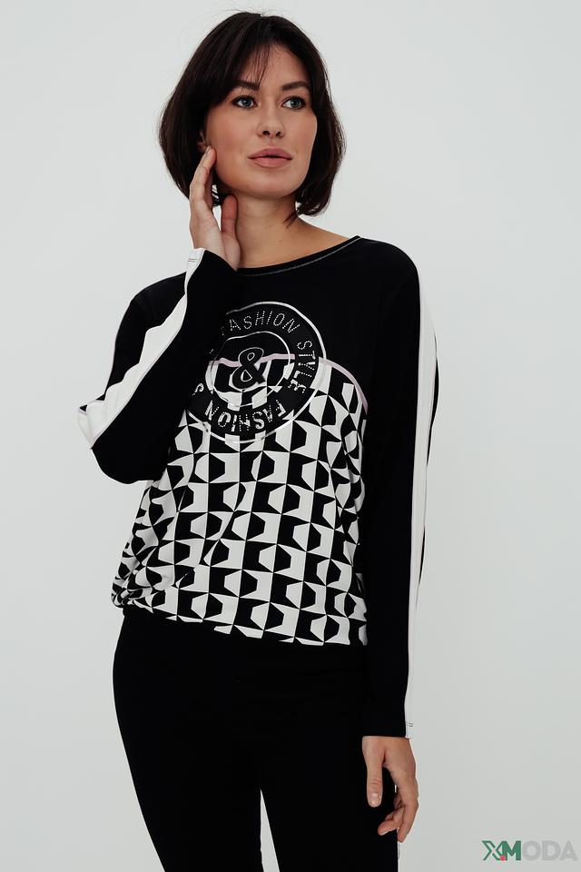 Чёрная блуза от Tuzzi с оригинальным геометрическим принтом и контрастными вставками. Модель выполнена из мягкой вискозы с добавлением эластана, обеспечивающего комфортную посадку. Состав: вискоза 90%, эластан 10%