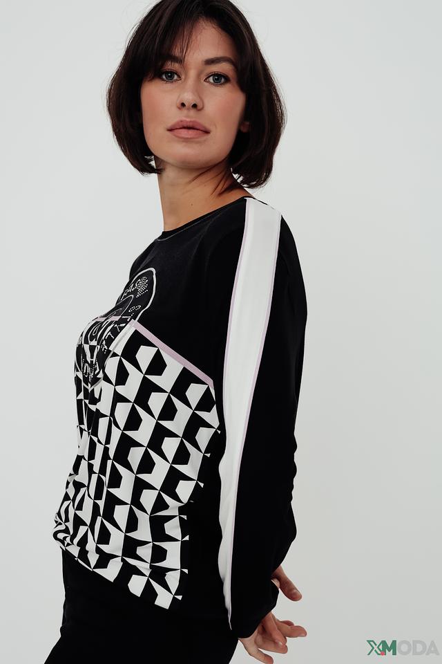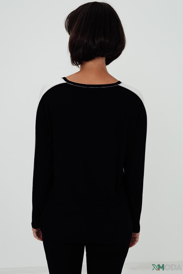 Блуза имеет свободный крой, который обеспечивает комфорт при носке. Длинные рукава и круглый вырез горловины делают ее универсальной для различных образов. Контрастные белые полосы на рукавах и по бокам добавляют динамики и акцента.