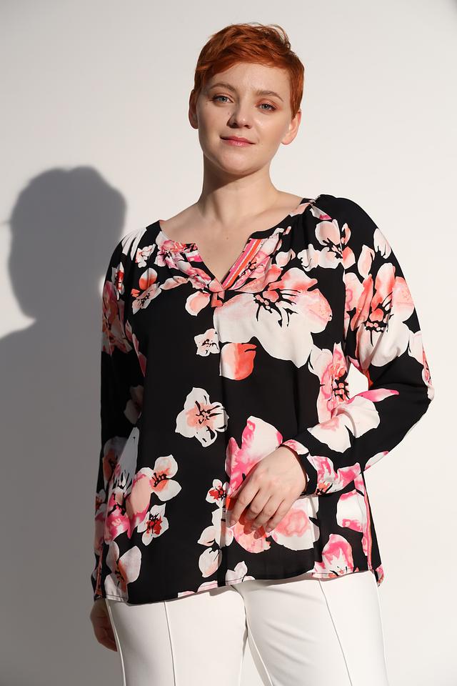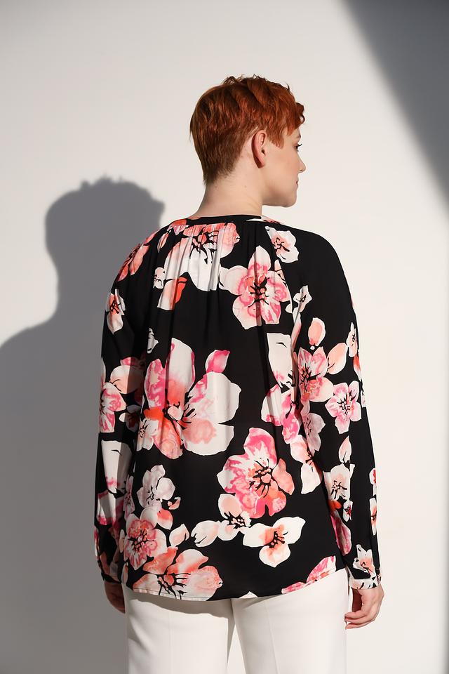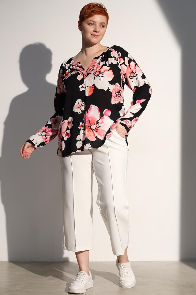 Блуза имеет прямой крой, длинные рукава и V-образный вырез горловины. Главная особенность модели – яркий цветочный принт, который придает ей женственность и романтичность. Принт выполнен в нежных розовых и белых тонах на черном фоне.