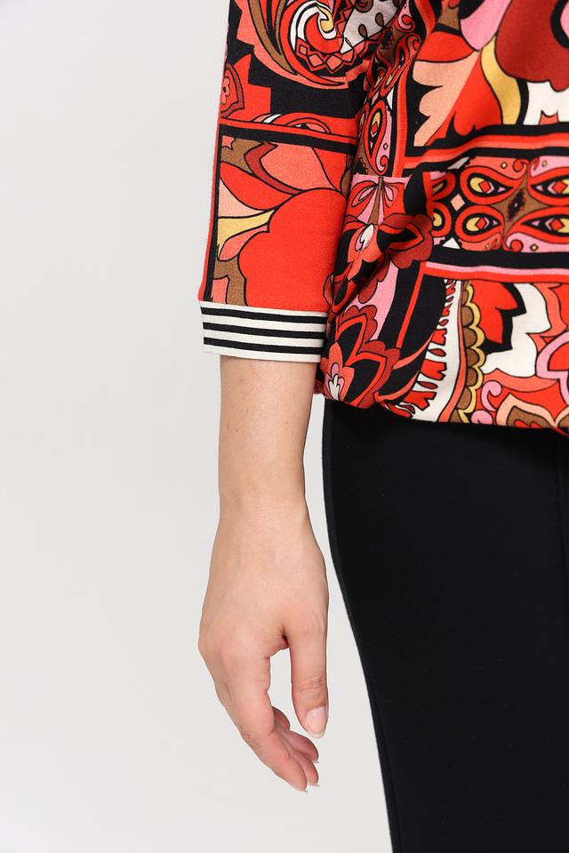 Блуза имеет округлый вырез горловины и короткие рукава 3/4 с манжетами. Особенность модели – эффектный принт в этническом стиле, выполненный в насыщенных оттенках красного, коричневого и бежевого. Принт покрывает всю поверхность блузы, создавая динамичный и запоминающийся образ.
