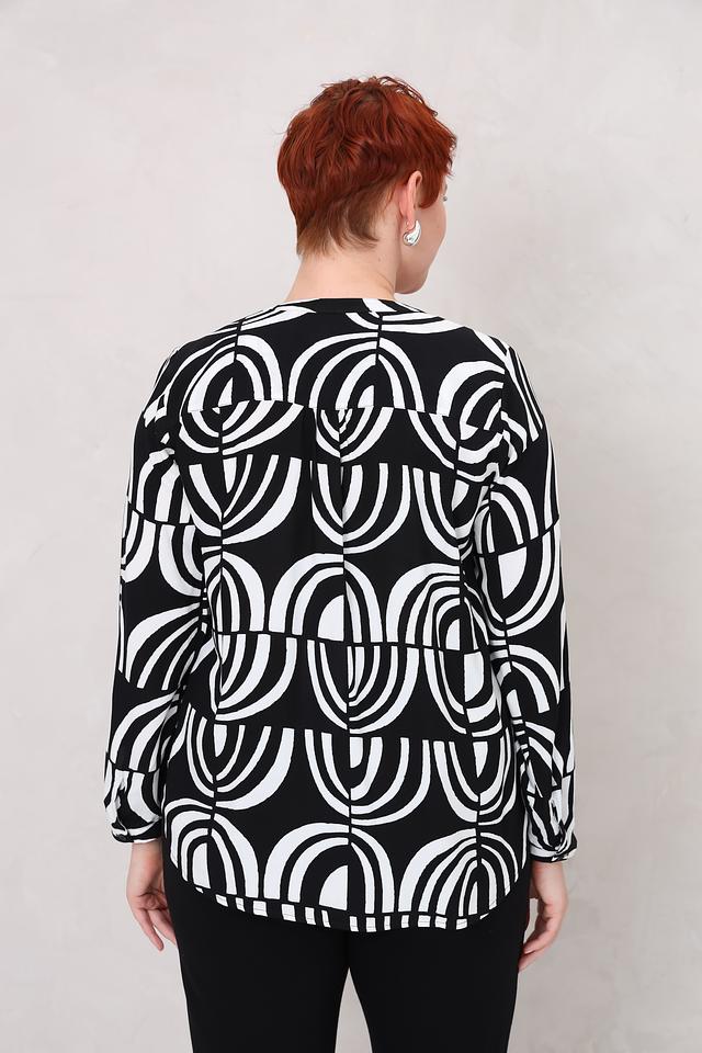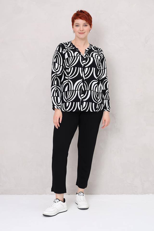 Блуза имеет свободный крой и длинные рукава. V-образный вырез горловины дополнен небольшой планкой с пуговицами. Главная особенность модели – эффектный черно-белый принт с геометрическим рисунком, который придает ей современный и стильный вид.