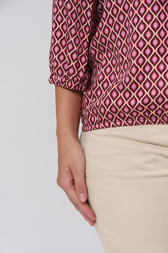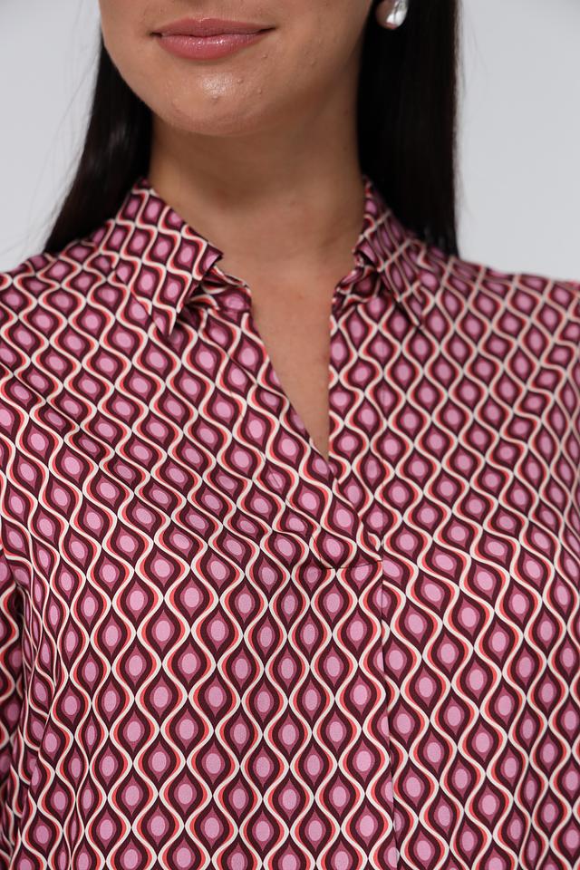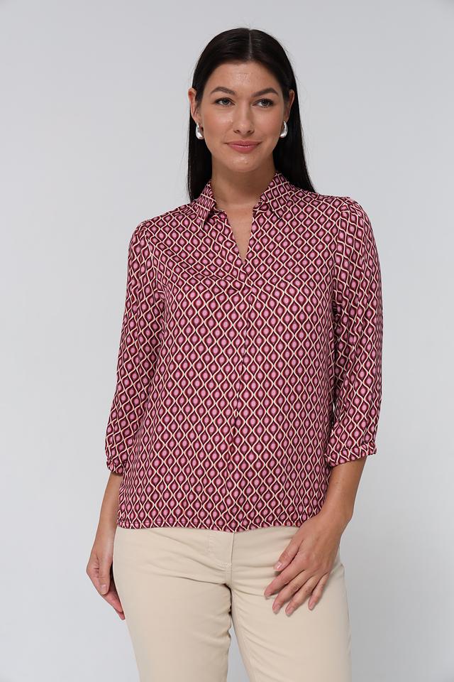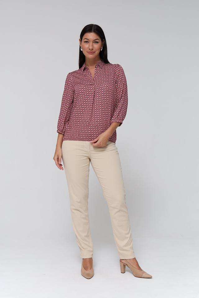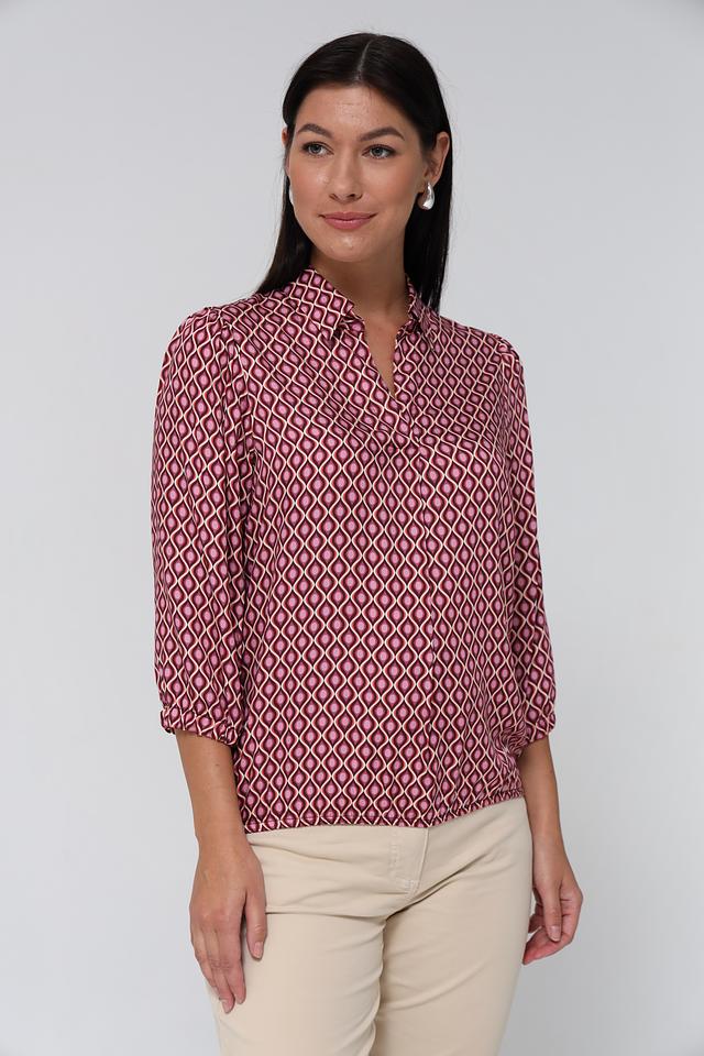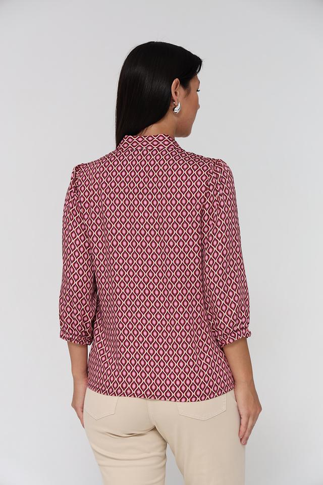 Блузка Bianca вискозного состава, бордового цвета с геометрическим принтом. Модель с V-образным вырезом и рукавом 3/4. Идеально подходит для создания элегантного образа. Состав: вискоза 100%