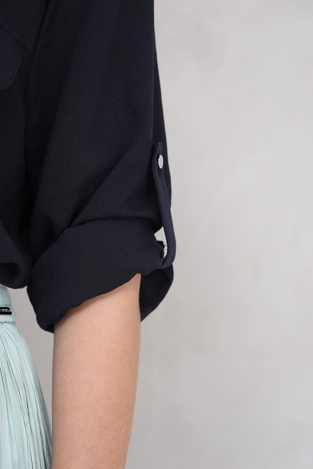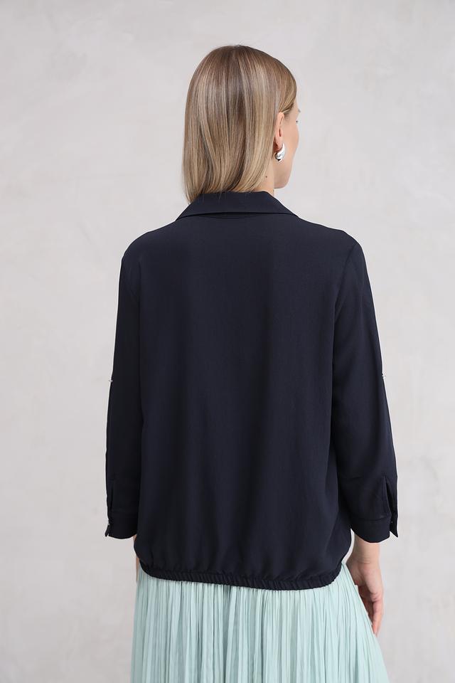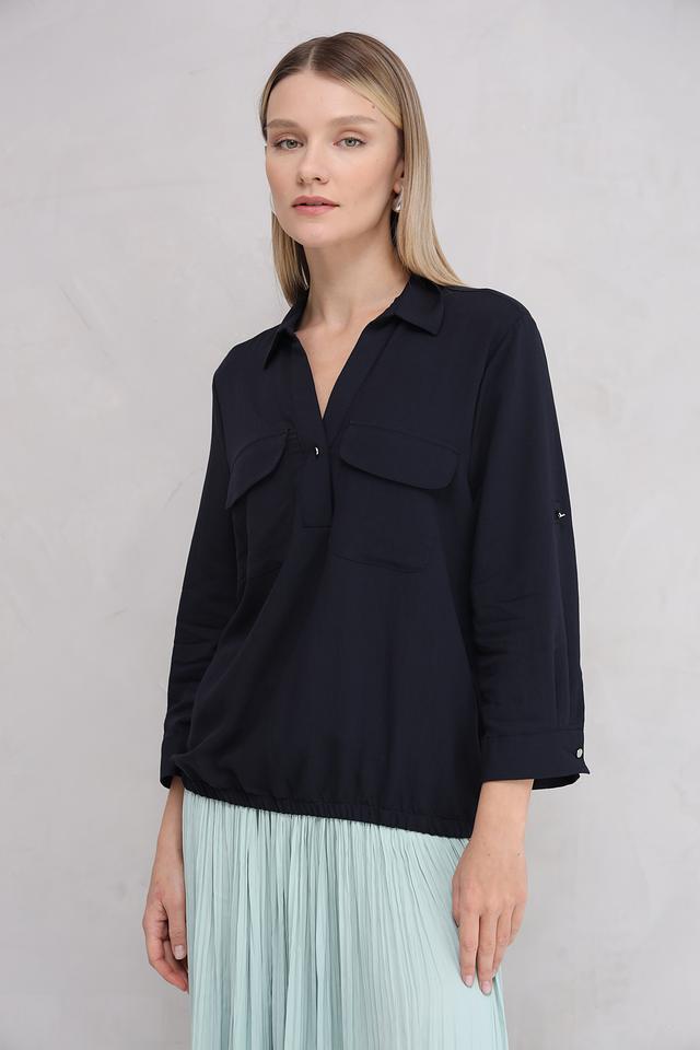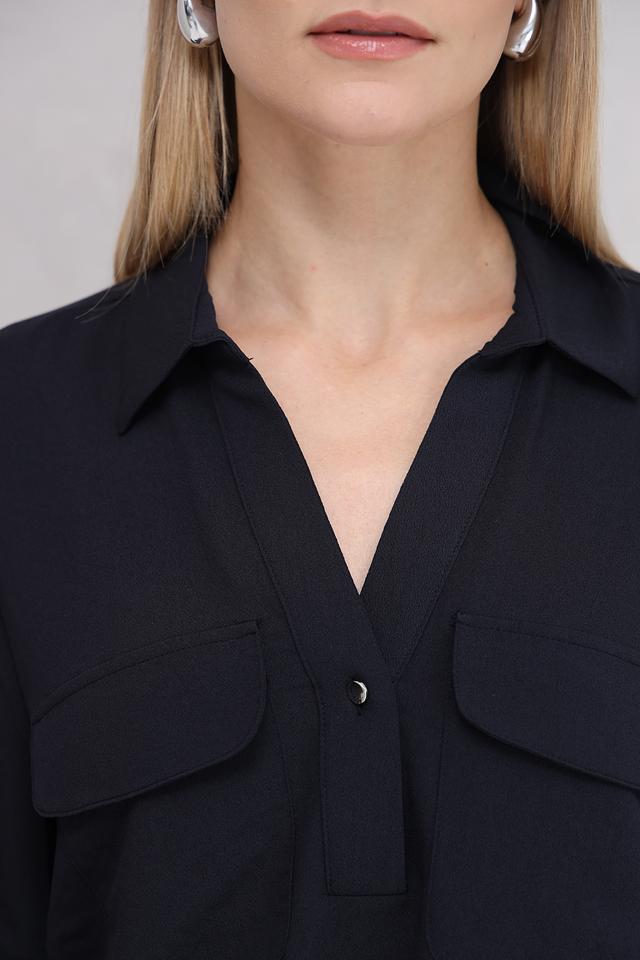 Блуза имеет V-образный вырез, который подчеркивает зону декольте, и короткие рукава с манжетами на пуговицах. На груди расположены два накладных кармана, которые добавляют блузе функциональности и стиля.